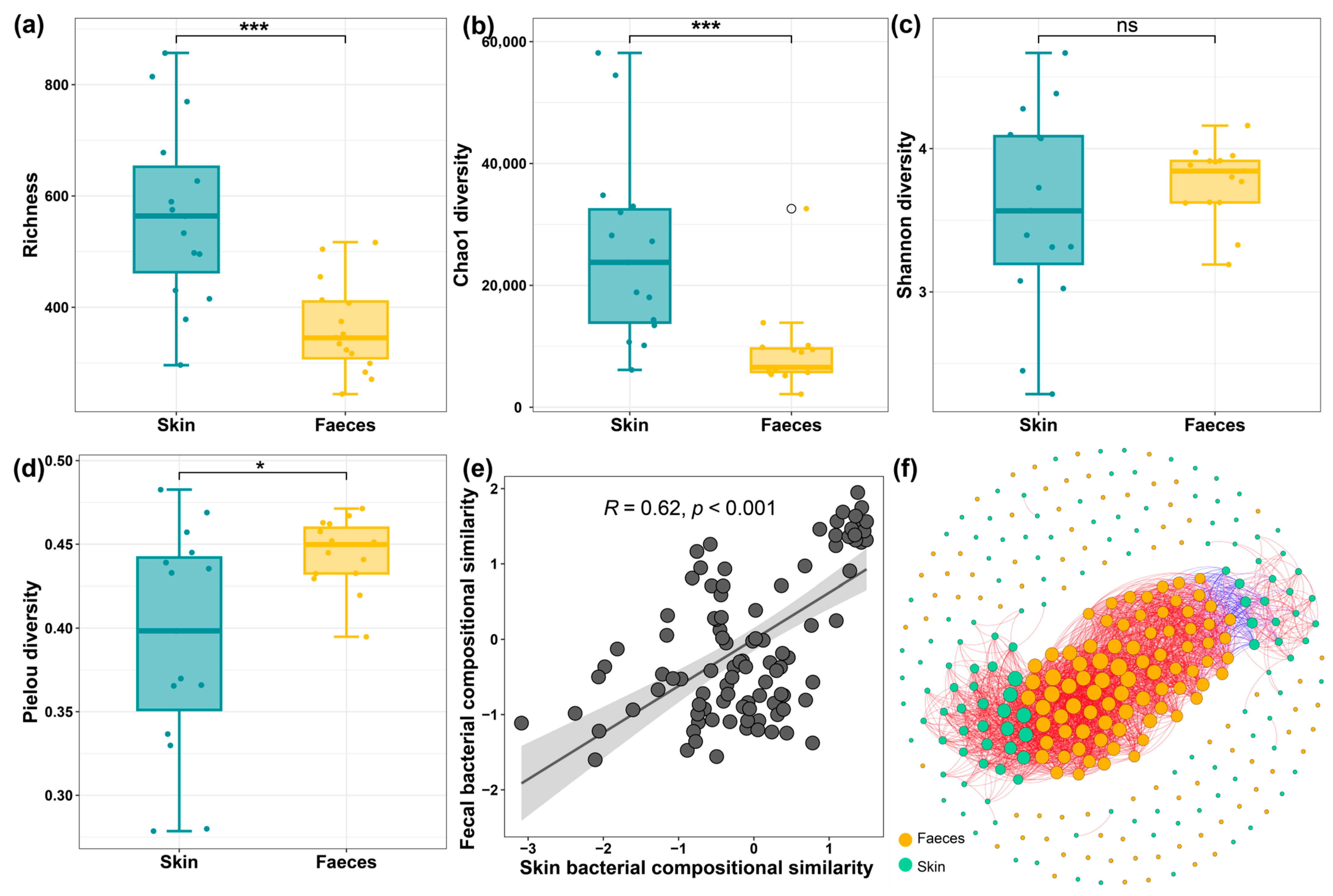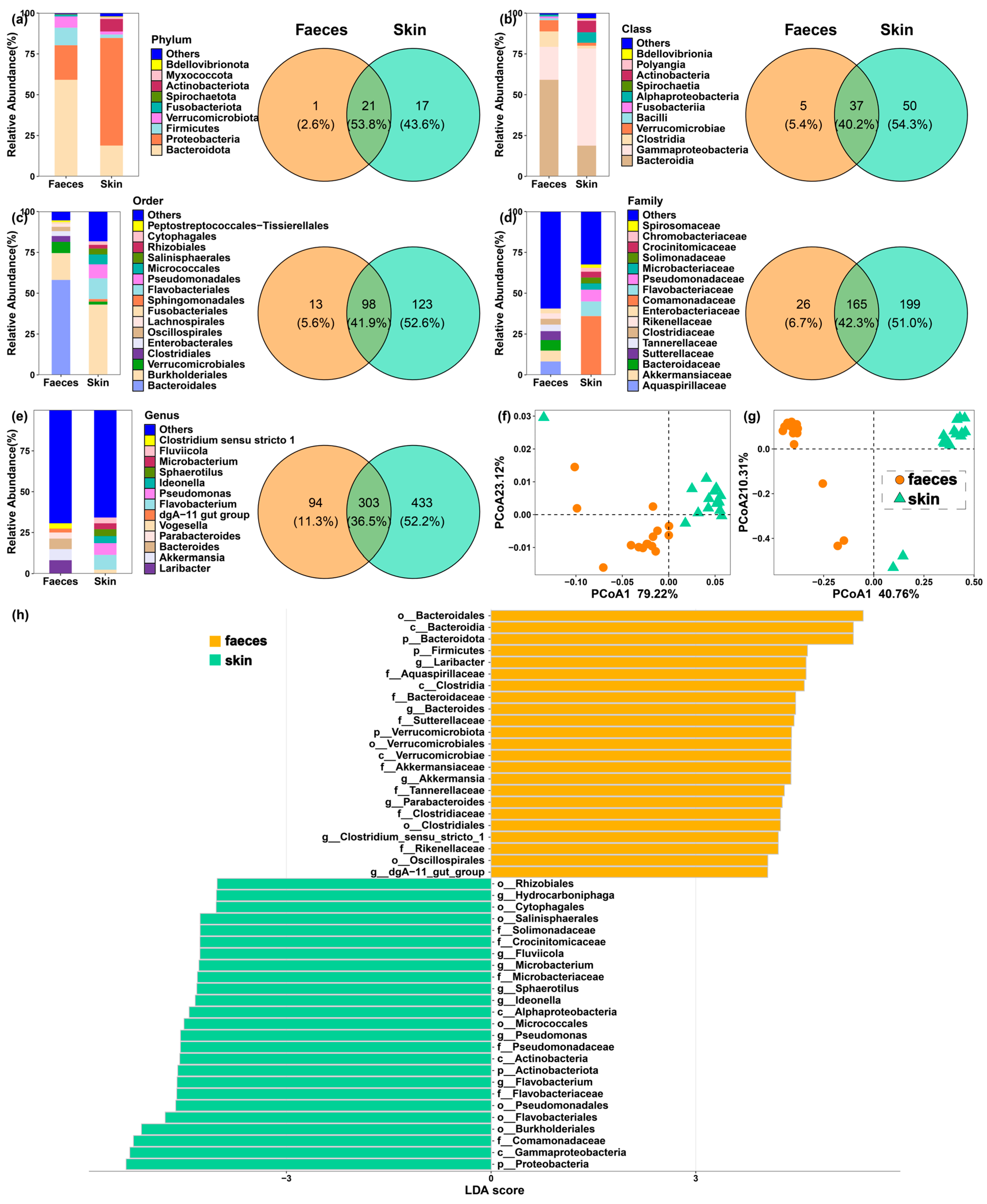 3.3. The Diversity of Skin and Faecal Microbiome and Their Relationships