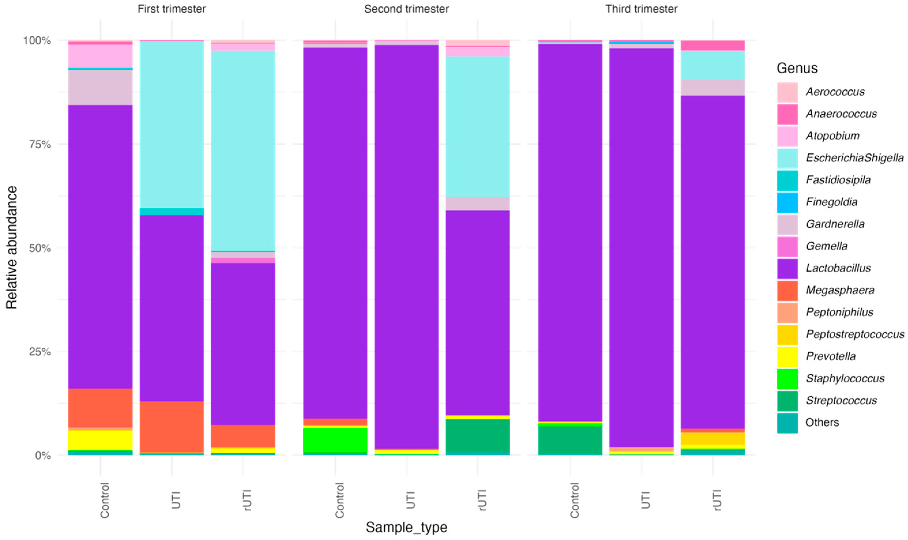 Relative abundance analysis of the 15 most abundant genera was performed across the different clinical groups (Control, UTI, and rUTI) and trimesters of pregnancy (