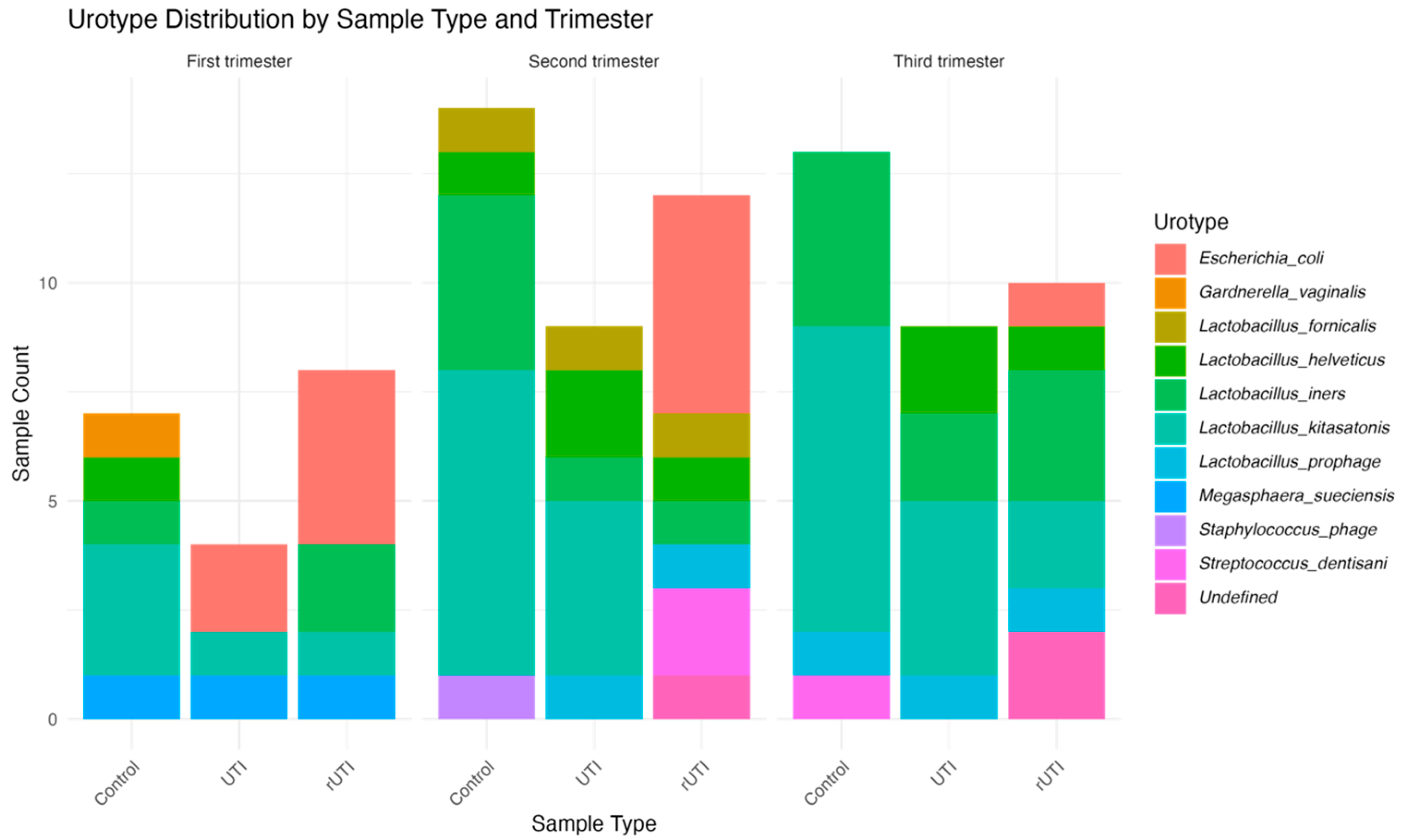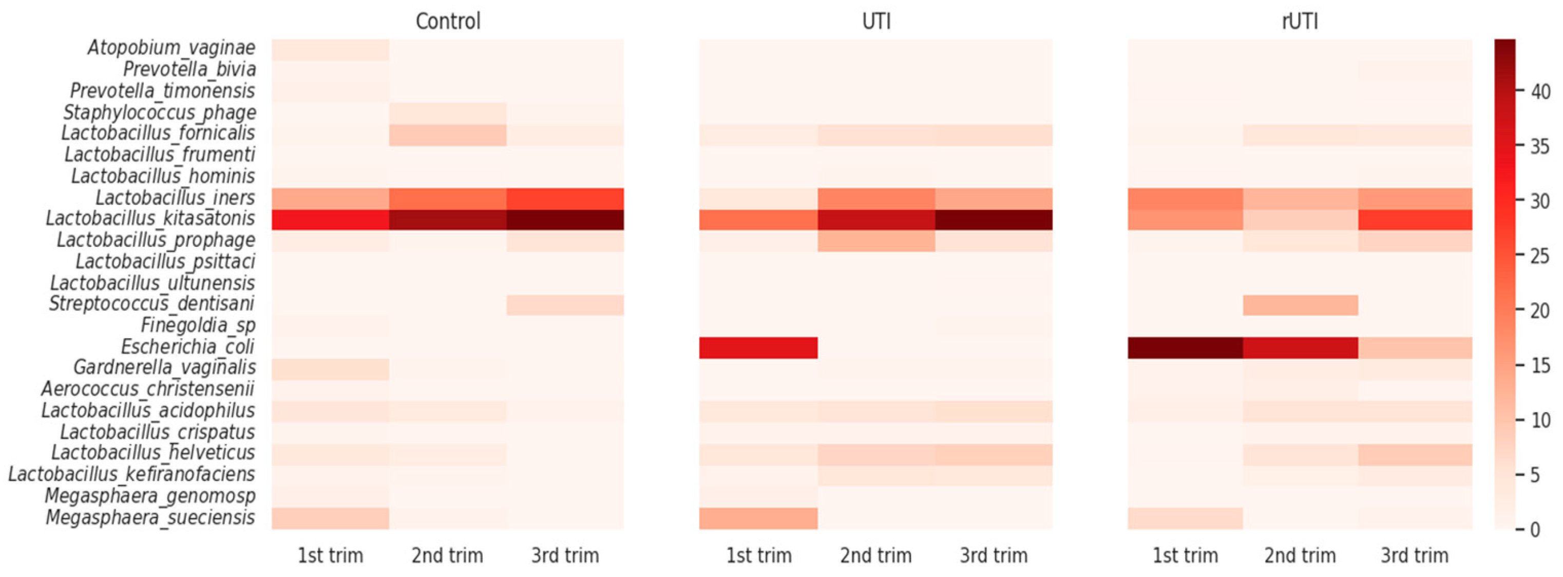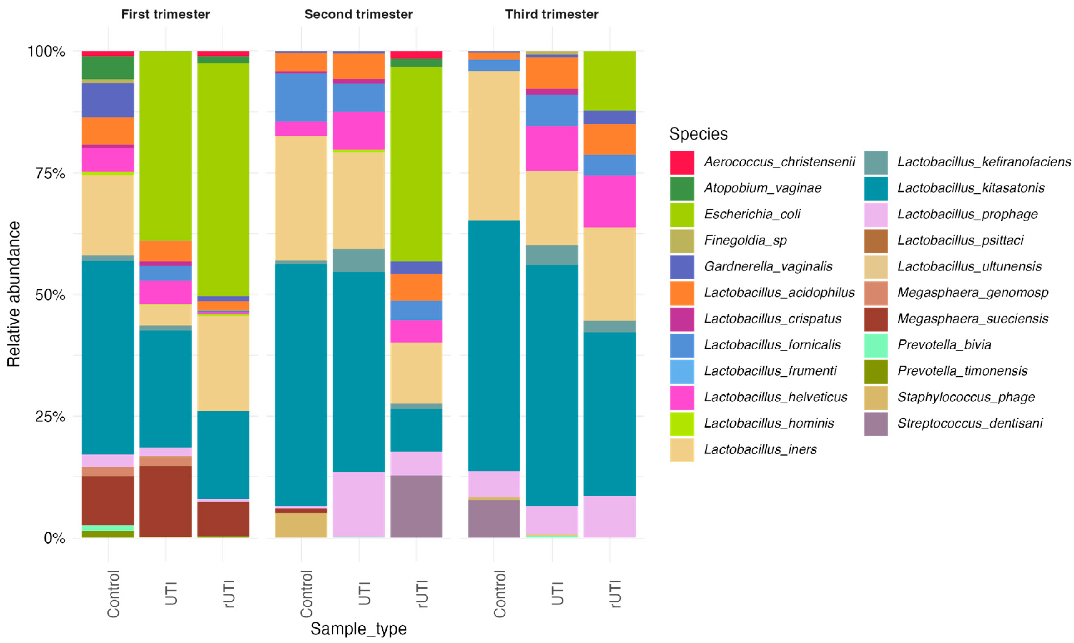 L. kitasatonis, which displayed elevated levels across all trimesters. In the control group, its abundance was high in the first trimester and progressively increased thereafter. A similar trend was observed in the UTI cohort, whereas in the rUTI cohort its abundance remained low with a relative increase during third trimester.