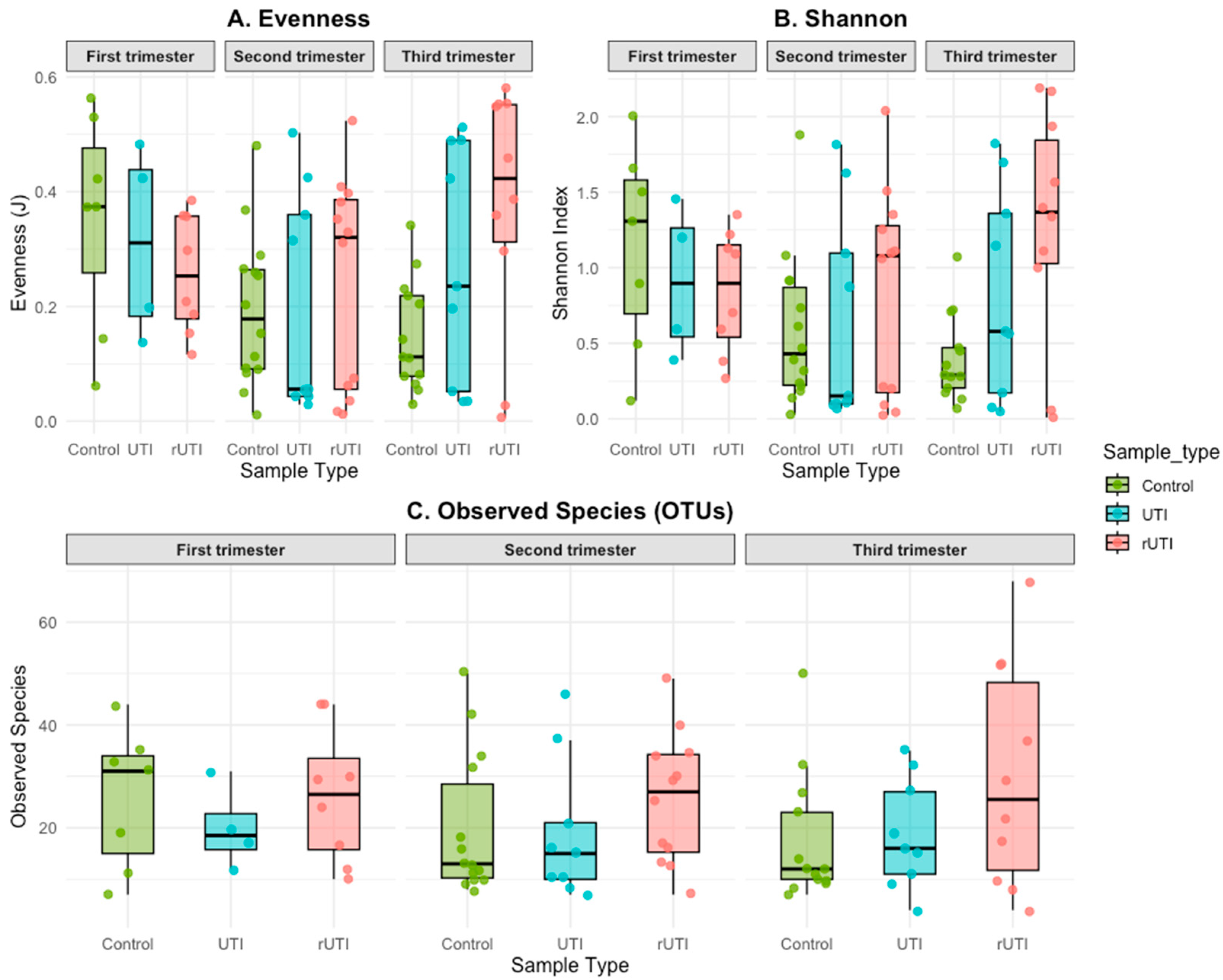 Analysis of alpha diversity revealed contrasting patterns across study groups: in control pregnancies, Evenness and Shannon indices decreased with advancing gestation, whereas in UTI and rUTI patients they progressively increased. This behavior can be explained by species composition: during the first trimester, control samples displayed a higher number of taxa, but as pregnancy advanced, relative diversity was reduced by lactobacilli dominance, reflecting the consolidation of a more stable, uniform microbiome. In contrast, UTI and rUTI patients showed an increase in diversity, suggesting a more unstable ecosystem with multiple taxa competing in a dysbiotic context. These findings are consistent with previous reports indicating that urogenital