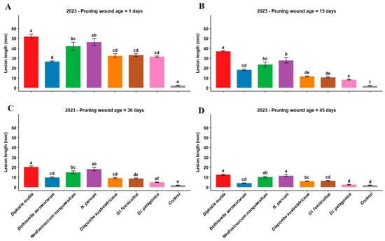 (A–D): Lesion length (mm) induced by Diplodia mutila (SC-CH-1, red), Dothiorella sarmentorum (Dsar-1, blue), Neofusicoccum nonquaesitum (VLC-1-6-20, green), N. parvum (NP-2022, purple), Diaporthe australafricana (VLC-1-2-20, orange), Di. foeniculina (SR-8, brown), and Di. patagonica (VLC-2-5-20, pink): control = sterile agar plug (gray), on pruning wounds of ‘Chandler’ English walnut of different ages; 1 day (A), 15 days (B), 30 days (C), and 45 days (D), during 2023. The lesions were measured at 6 months post-inoculation. Error bars represent mean lesion length, and letters above the bars imply significant differences by Fisher’s LSD test (p < 0.05).