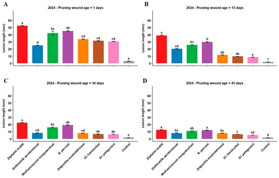 (A–D): Lesion length (mm) induced by Diplodia mutila (SC-CH-1, red), Dothiorella sarmentorum (Dsar-1, blue), Neofusicoccum nonquaesitum (VLC-1-6-20, green), N. parvum (NP-2022, purple), Diaporthe australafricana (VLC-1-2-20, orange), Di. foeniculina (SR-8, brown), and Di. patagonica (VLC-2-5-20, pink): control = sterile agar plug (gray), on pruning wounds of ‘Chandler’ English walnut of different ages; 1 day (A), 15 days (B), 30 days (C), and 45 days (D), during 2024. The lesions were measured at 6 months post-inoculation. Error bars represent mean lesion length, and letters above the bars imply significant differences by Fisher’s LSD test (p < 0.05).
