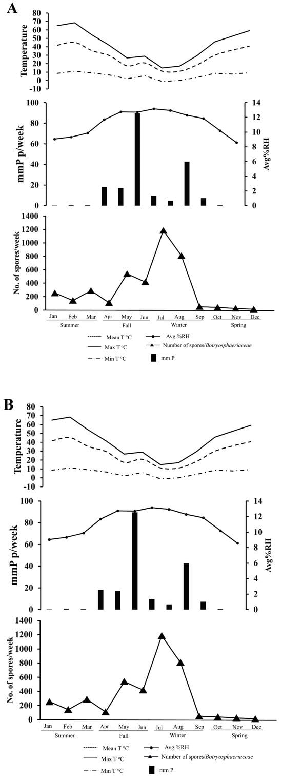 3.2. Monitoring of Botryosphaeriaceae Spore Dispersal and Weather Conditions