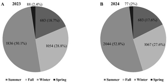 Total accumulated number of Botryosphaeriaceae spores detected in each season during 2023 (A) and 2024 (B) in a walnut ‘Chandler’ orchard located at the San Rafael experimental Station in Maule Region, Chile.