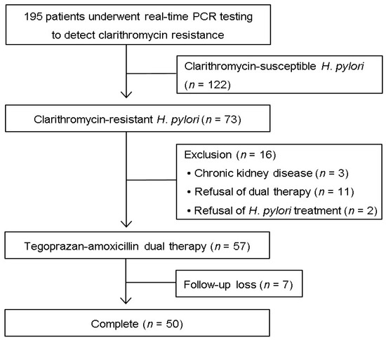 During the study period, 195 patients were diagnosed with H. pylori infection by the RT-PCR assay (Figure 1). Based on these results, 122 patients without A2142G and A2143G point mutations were not eligible for this study. The remaining 73 patients infected with clarithromycin-resistant H. pylori strains were invited to participate in the study. Three patients with chronic kidney disease, 11 who did not consent to dual therapy, and two who refused H. pylori eradication treatment were excluded from the study. Therefore, a total of 57 patients were included in this study. Of these, seven patients were lost to follow-up that was designed to evaluate the outcome of H. pylori eradication treatment.