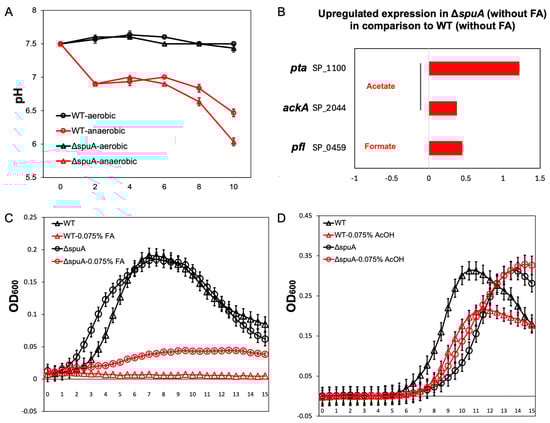 The respiratory pathogen S. pneumoniae can cause inflammation in the lungs and increase capillary leakage during infections in the lower respiratory tract. This leads to fluid accumulation in the lungs and reduces oxygen availability [16]. In response to this low-oxygen environment, S. pneumoniae shifts its metabolism toward anaerobic pathways [17]. Interestingly, the ΔspuA strain produced acidic byproducts more quickly than the wild-type (WT) strain under anaerobic conditions (Figure 1A). RNA sequencing showed that this increase in acidity was due to higher expression of genes involved in acetate (pta, ackA) and formate (pfl) production (Figure 1B). Since acidic conditions can be harmful to S. pneumoniae, the increased acid production by the ΔspuA strain was opposite to our expectations. Further tests revealed that the ΔspuA strain had much better survival in the presence of formic acid. While the WT strain could not grow at a concentration of 0.075% (v/v) formic acid, the ΔspuA strain was still able to grow (Figure 1C). Similarly, under acetic acid stress, the growth of the ΔspuA and wild-type strains was comparable during the first 11 h, but after 11 h, the ΔspuA strain exhibited significantly enhanced growth. (Figure 1D).