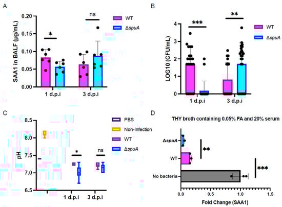 For the experiments shown in Figure 2, three independent infection experiments were performed. In each experiment, 14 mice were infected with wild-type and 14 mice with ΔspuA strains. At 24 h post-infection, 7 mice from each group were euthanized, and BALF was collected from each mouse to measure bacterial load, pH, and SAA levels. At 72 h post-infection, the remaining mice in each group were euthanized, and BALF was collected to assess bacterial load, pH, and SAA levels.