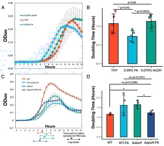 Based on the results from the animal infection experiments, we suspected that the acidic environment might support the increased growth of the ΔspuA strain (Figure 2A,B). We also observed that this strain produces more formic and acetic acids under low-oxygen conditions (Figure 1B). To test whether these acids affect bacterial growth, we added 0.075% acetic acid or 0.05% formic acid to THY broth and measured the doubling time of the ΔspuA strain. The results showed that 0.05% formic acid significantly improved its growth (Figure 3A,B). Without this addition, the ΔspuA strain grew more slowly than the wild-type strain, but with formic acid, its growth was noticeably faster (Figure 3C,D).