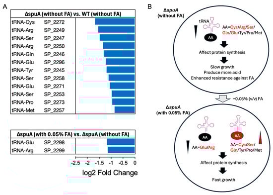 The addition of formic acid restored the expression of tRNA relating to amino acid usage. (A) RNA-seq results showed that the significant expression change (p < 0.05) of tRNA relating to multiple amino acid usage is downregulated in ΔspuA S. pneumoniae. Additionally, the addition of 0.05% (v/v) formic acid could restore the expression of most tRNAs relating to amino acid usage. n = 3 biological replicates per group. Data are presented as mean. (B) Graphic illustration of the change in tRNA expression relating to amino acid usage in ΔspuA S. pneumoniae with/without formic acid.
