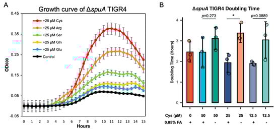 Wild-type and ΔspuA S. pneumoniae TIGR4 strains were grown to the early-exponential phase (OD600 of 0.1). Then, 5 µL of the bacterial culture was added to 195 µL of THY solution supplemented with either 0.075% (v/v) acetic acid, 0.075% (v/v) formic acid, or various amino acids (25 µM cysteine, alanine, serine, glutamic acid or glutamine), depending on the experimental condition. The doubling time was calculated using the OD600 values measured at the beginning and end of a 3 h window during the logarithmic growth phase. The values were entered into the online doubling time calculator provided by Omni Calculator (https://www.omnicalculator.com/math/doubling-time (accessed on 12 February 2025)).