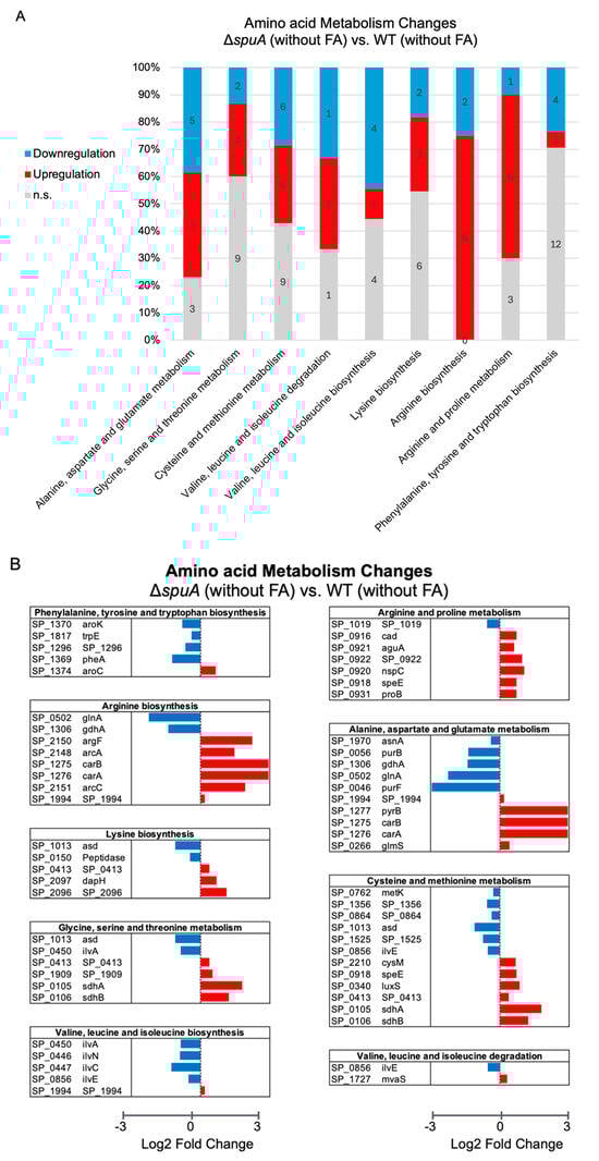Comprehensive analysis of amino acid metabolism in the ΔspuA S. pneumoniae. (A) Amino acid metabolism changes between ΔspuA and wild-type S. pneumoniae using KEGG-based gene function annotations from the TIGR4 genome. Downregulation (blue) or upregulation (red) means those genes were significantly lower or higher expression in ΔspuA strain compared with wild-type strain. (B) Graphic summary of amino acid pathway associated with formate production in S. pneumoniae TIGR4 strain based on KEGG metabolism database. (C) Detailed information of amino acid metabolism changes between ΔspuA strain with or without the addition of 0.05% (v/v) formic acid. Genes were functionally categorized based on the KEGG metabolism database.