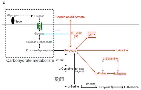 Additionally, the pfl gene (SP_0459), which encodes a key enzyme for formic acid production, was upregulated in the ΔspuA strain (Figure 1B). According to KEGG pathway maps, the metabolism of alanine, arginine, and proline can generate pyruvate, which serves as a precursor for formic acid production. These transcriptomic and pathway-based observations support the idea that the ΔspuA strain may compensate for impaired glycogen use by upregulating amino acid metabolic pathways that ultimately enhance formic acid production (Figure 6C).