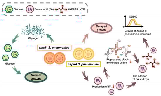 In conclusion, the absence of SpuA results in less efficient glycogen utilization and slower bacterial growth. To compensate, the ΔspuA strain shifts its metabolism toward increased formic acid production, which in turn facilitates amino acid utilization, particularly cysteine, and supports bacterial growth (Figure 7).