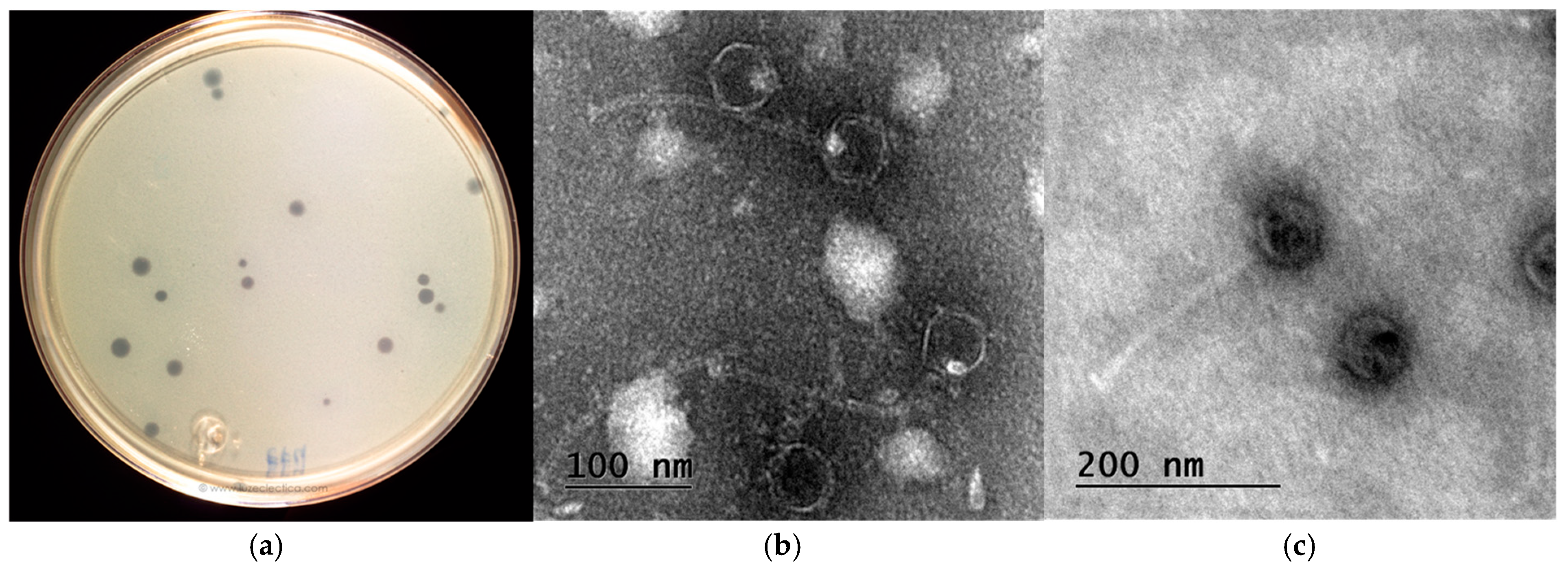- Van-Twest, R.; Kropinski, A.M. Bacteriophage enrichment from water and soil. In Bacteriophages: Methods and Protocols; Clokie, M.R.J., Kropinski, A.M., Eds.; Humana Press: Totowa, NJ, USA, 2009; pp. 15–20. [Google Scholar]
