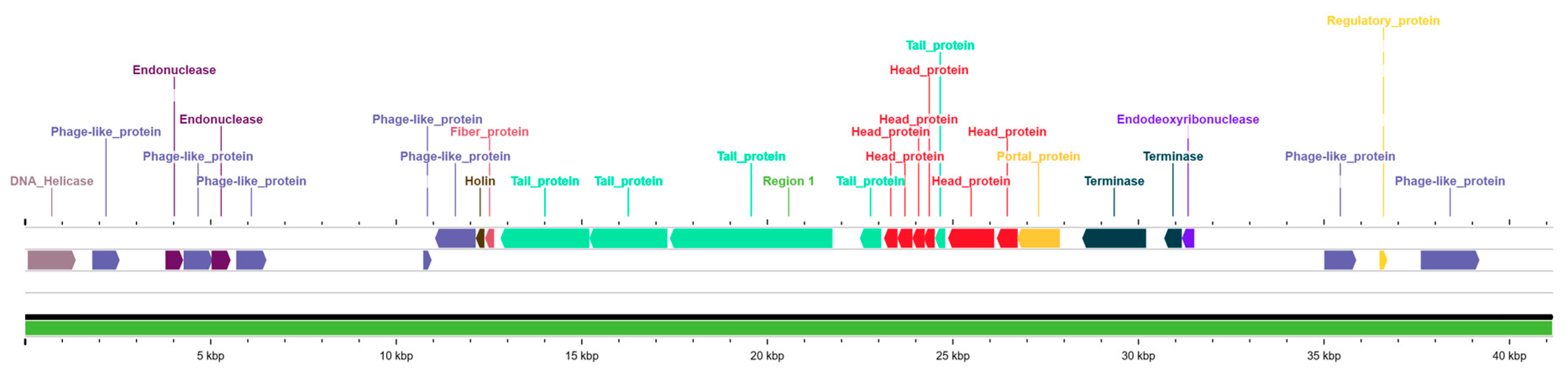 - Bouras, G.; Nepal, R.; Houtak, G.; Psaltis, A.J.; Wormald, P.-J.; Vreugde, S. Pharokka: A fast scalable bacteriophage annotation tool. Bioinform 2023, 39, btac776. [Google Scholar] [CrossRef] [PubMed]