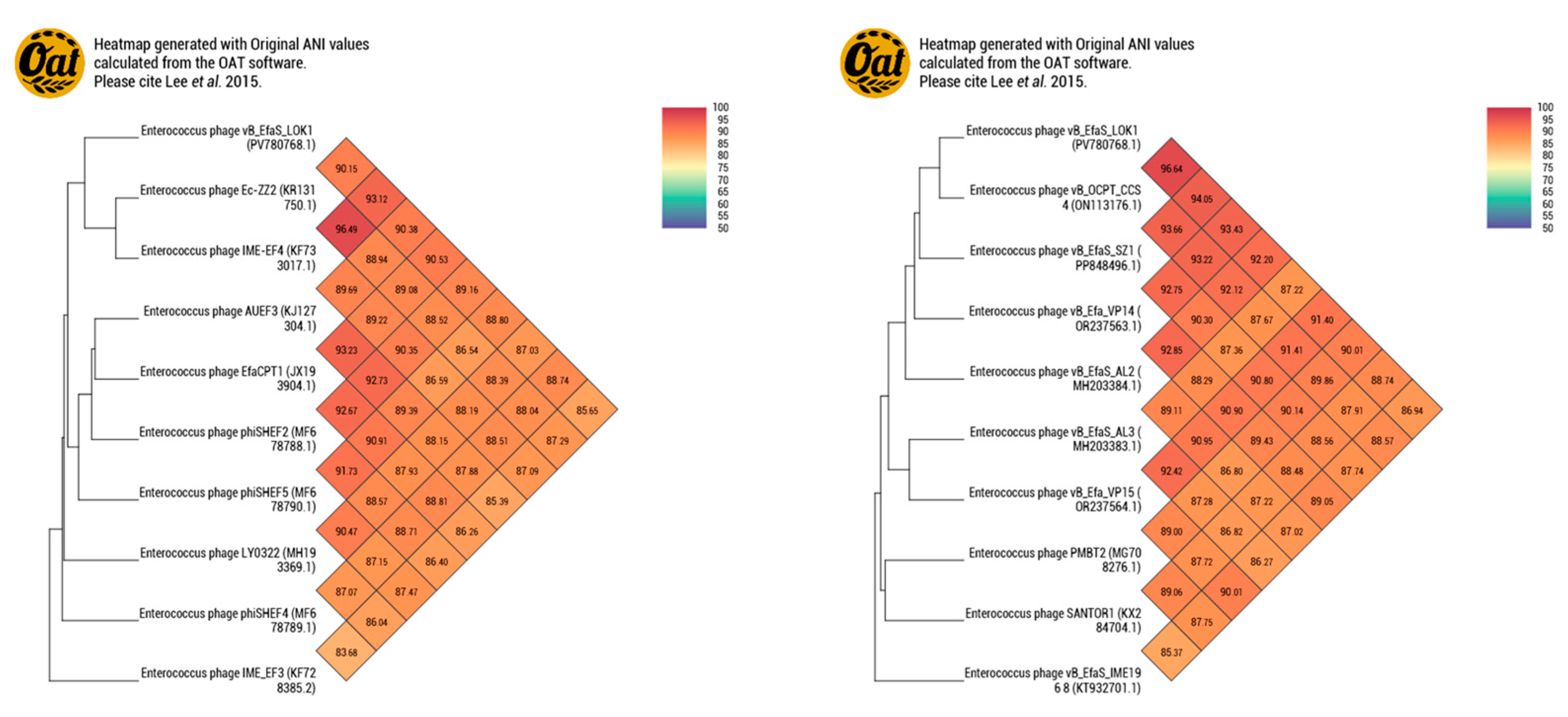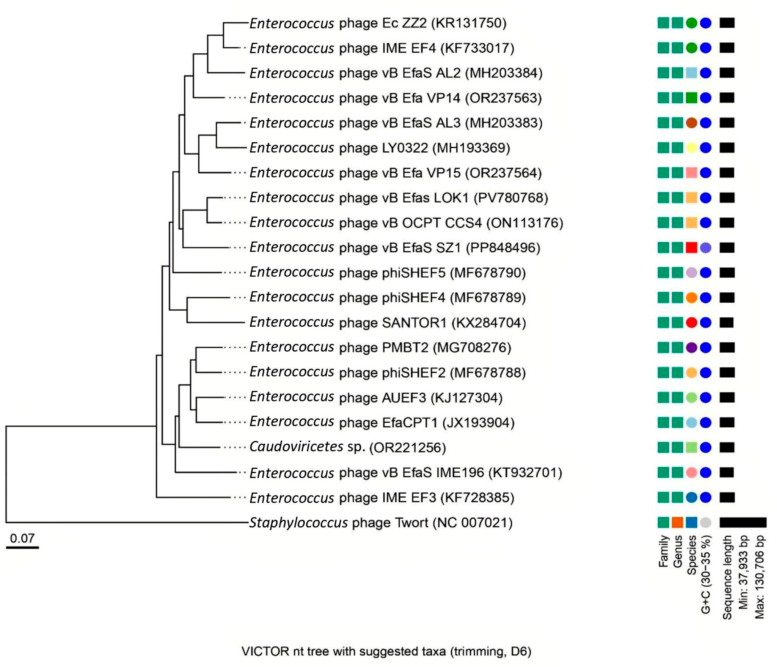 - Abed, S.; Sholeh, M.; Khazani Asforooshani, M.; Shafiei, M.; Hashemi Shahraki, A.; Nasr, S. Insights into the novel Enterococcus faecalis phage: A comprehensive genome analysis. PLoS ONE 2024, 19, e0301292. [Google Scholar] [CrossRef]