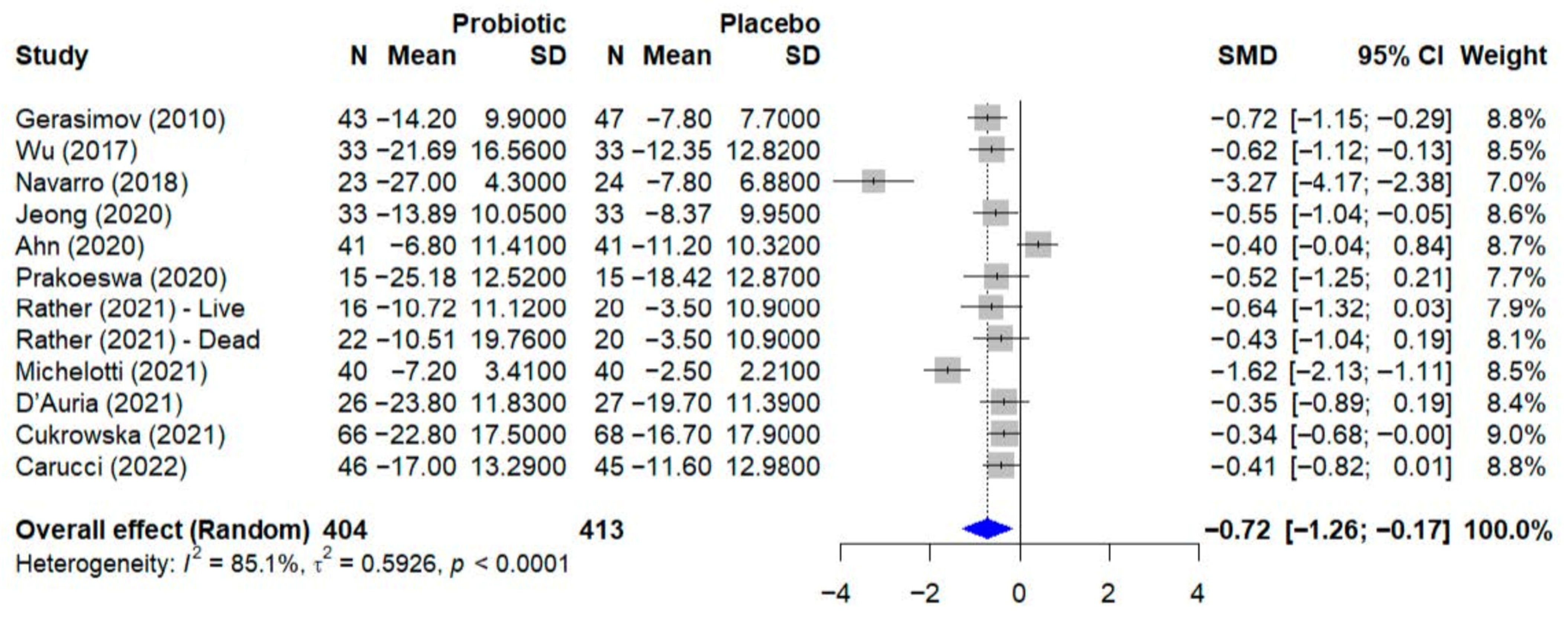 | Rather et al., 2021 [29] | L. sakei proBio65 (Live and Dead cells) | Oral powder (sachet) | 1 × 1010 cells/day | 12 weeks | Placebo (microcrystalline cellulose) and dead cell group |
