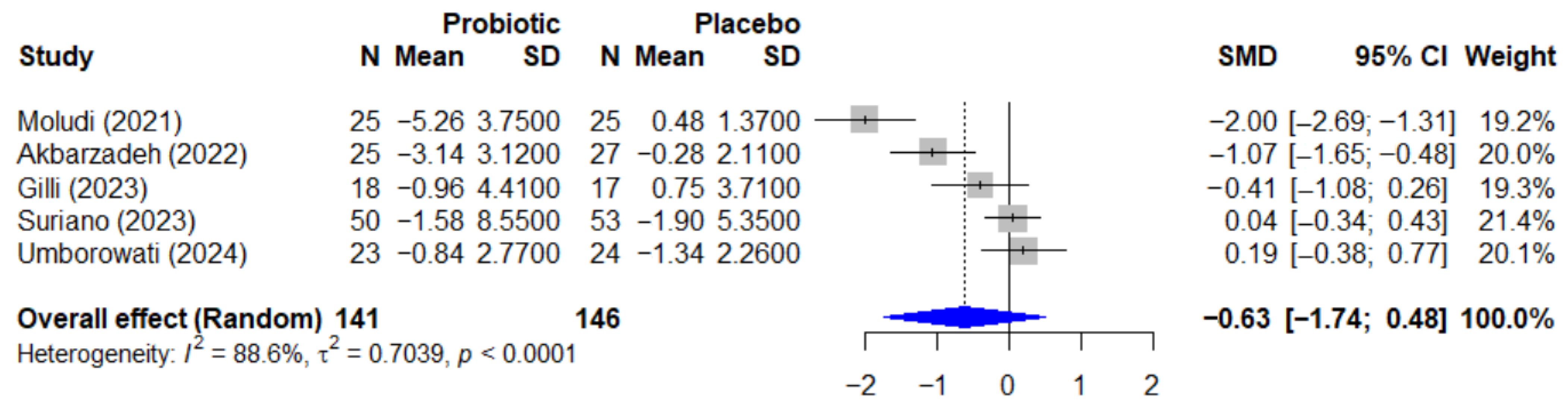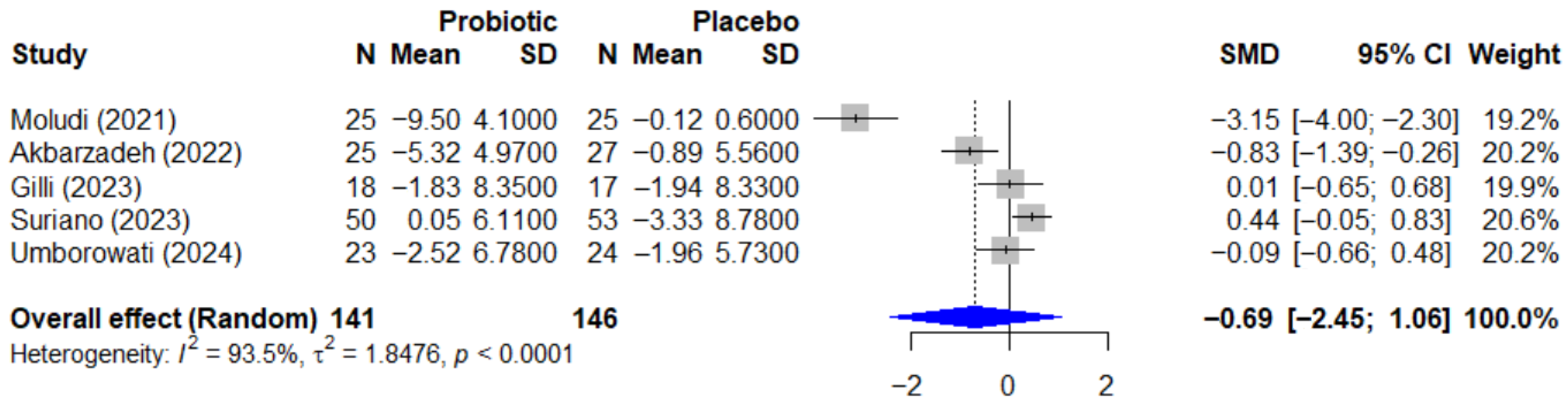 | Moludi et al., 2021 [38] | L. acidophilus, B. bifidum, B. lactis, B. longum | Oral drink | 1.8 × 109 CFU/day (total) | 8 weeks | Placebo |
