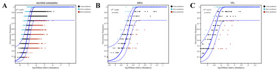 The Neutral Community Model (NCM) analysis demonstrated that stochastic factors strongly influenced the assembly processes of microbial taxa, ARGs, and VFs (Figure 4A–C). Microbial communities exhibited the highest stochastic process fit (R2 = 0.6958) and a migration rate (m) of 0.0398, indicating that environmental dispersal is the primary mechanism driving their assembly (Figure 4A). In contrast, ARGs showed significantly lower stochasticity (R2 = 0.4896) and migration rate (m = 0.0282) than microbial communities, suggesting stronger niche selection constraints on their assembly (Figure 4B). VFs displayed intermediate stochasticity (R2 = 0.6579, m = 0.0319), with a dispersal capacity positioned between microbial communities and ARGs (Figure 4C). Collectively, these findings indicate that stochastic dispersal processes exert a relatively stronger influence on microbial community structure, whereas ARGs assembly is concurrently subject to significant deterministic pressures. The migration pattern of VFs further suggests that their dispersal may be mediated by host microbial activities.