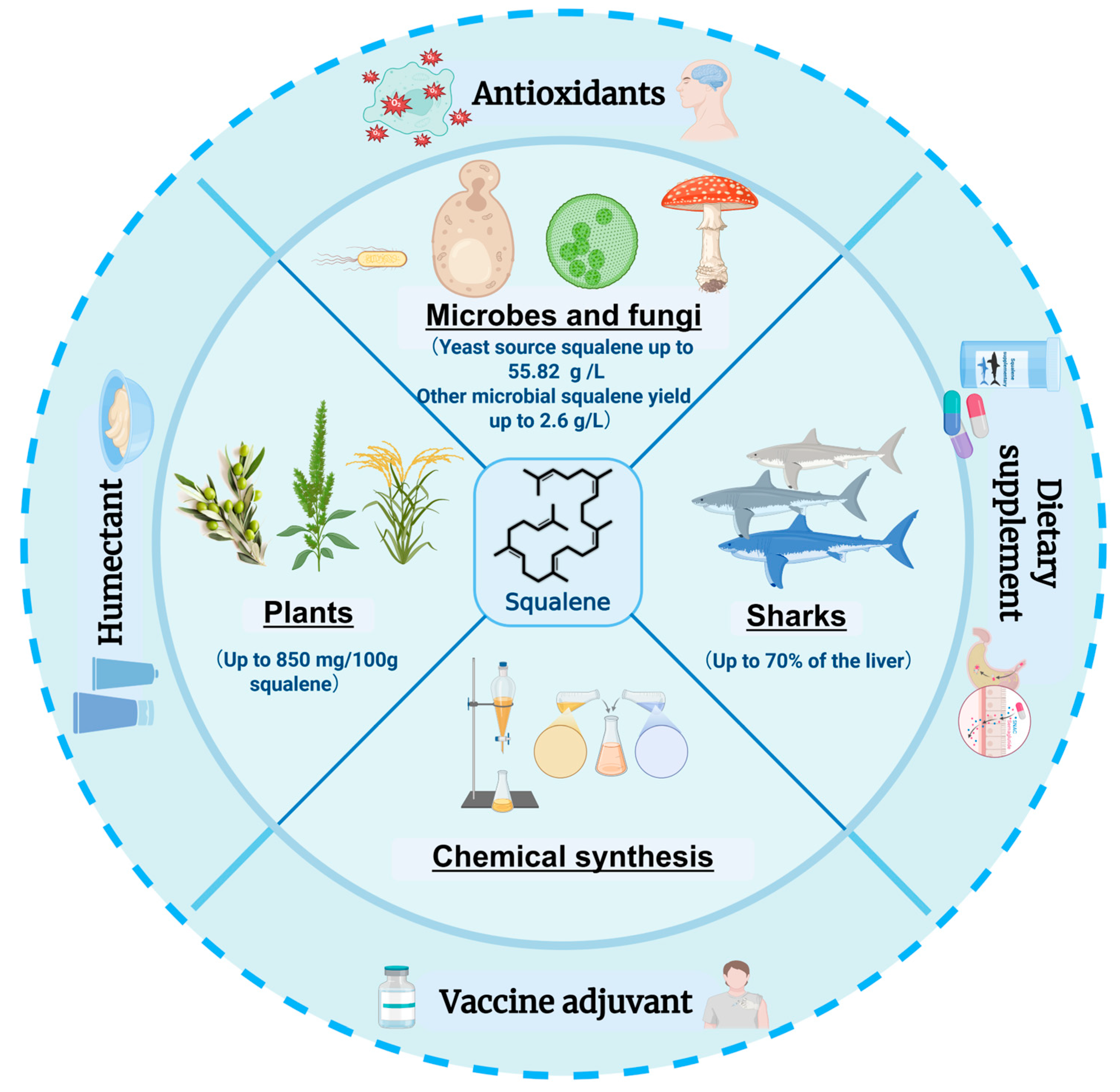 - Chai, L.; Che, J.; Qi, Q.; Hou, J. Metabolic engineering for squalene production: Advances and perspectives. J. Agric. Food. Chem. 2024, 72, 27715–27725. [Google Scholar] [CrossRef] [PubMed]