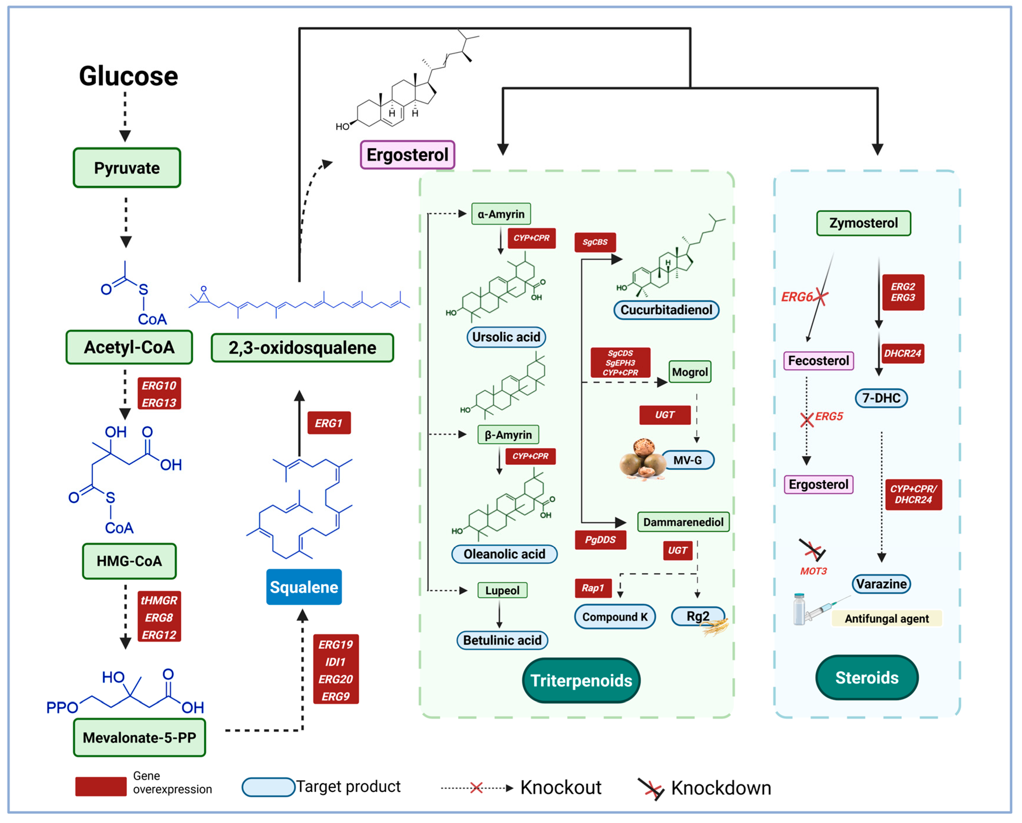 - Yin, X.; Zhang, Y.; Wei, W.; Zhao, X.; Xu, S.; Gao, S.; Zhou, J. Overproduction of cucurbitadienol through modular metabolic engineering and fermentation optimization in Saccharomyces cerevisiae. J. Agric. Food. Chem. 2025, 73, 718–726. [Google Scholar] [CrossRef] [PubMed]