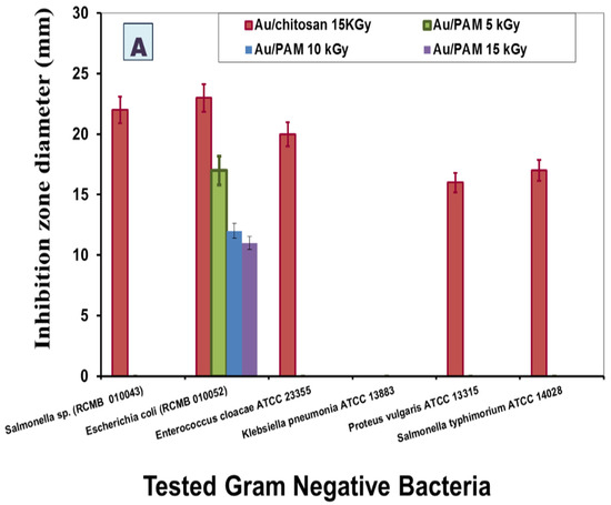 The susceptibility of some Gram-negative bacteria when treated with Au-NPs was assessed using the agar well diffusion method [samples 1, 2, and 3: Au-PAM at a dose of 15, 10, and 5 KGy, respectively; sample 4: Au–chitosan at 15 KGy. Enterococcus cloaca ATCC 23355, Escherichia coli (RCMB 010052), Klebsiella pneumonia ATCC 13883, Salmonella typhimorium ATCC 14028, and Proteus vulgaris ATCC 13315.