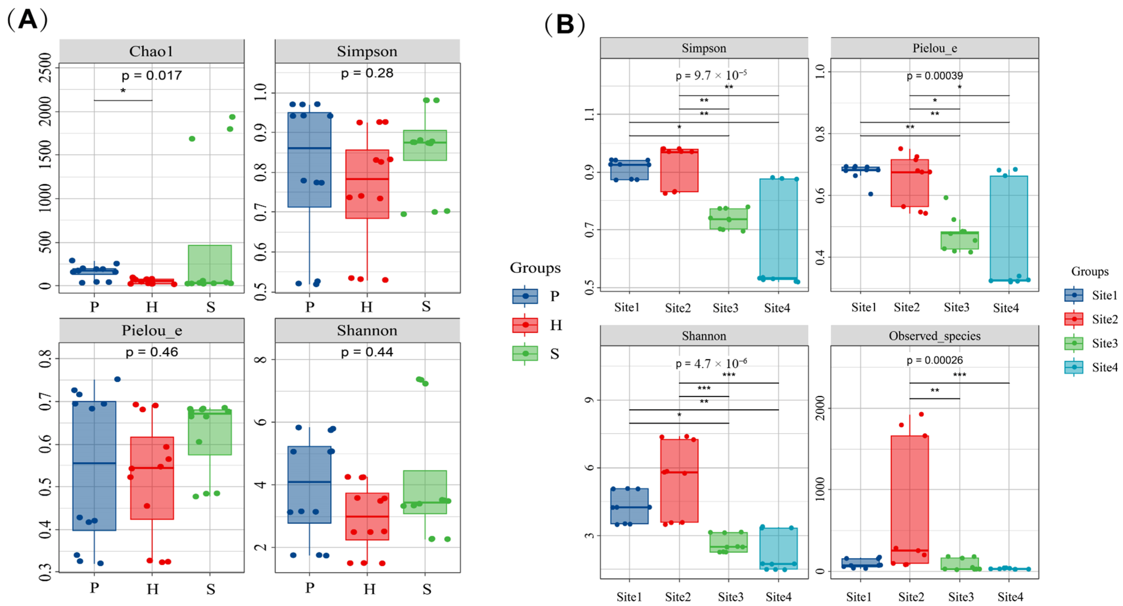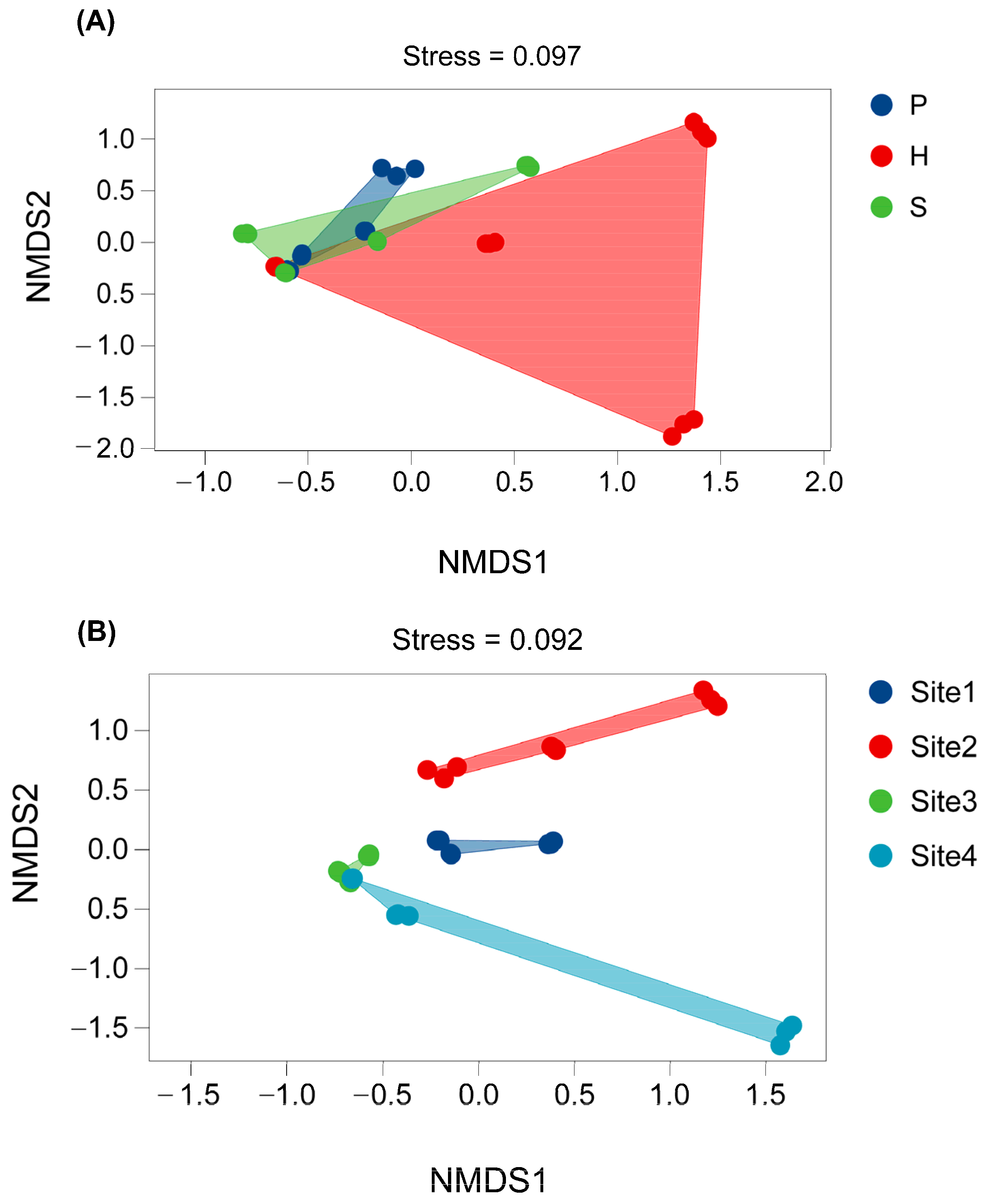 79]. Integrating these functional data, the higher alpha diversity observed in the stipe, compared to the hymenophore, can be attributed to the stipe’s broader functional niche availability, lower exposure to external disturbances, and stable metabolic synergies. In contrast, the functional specialization and stronger selective pressures within the hymenophore appear to limit its bacterial diversity.