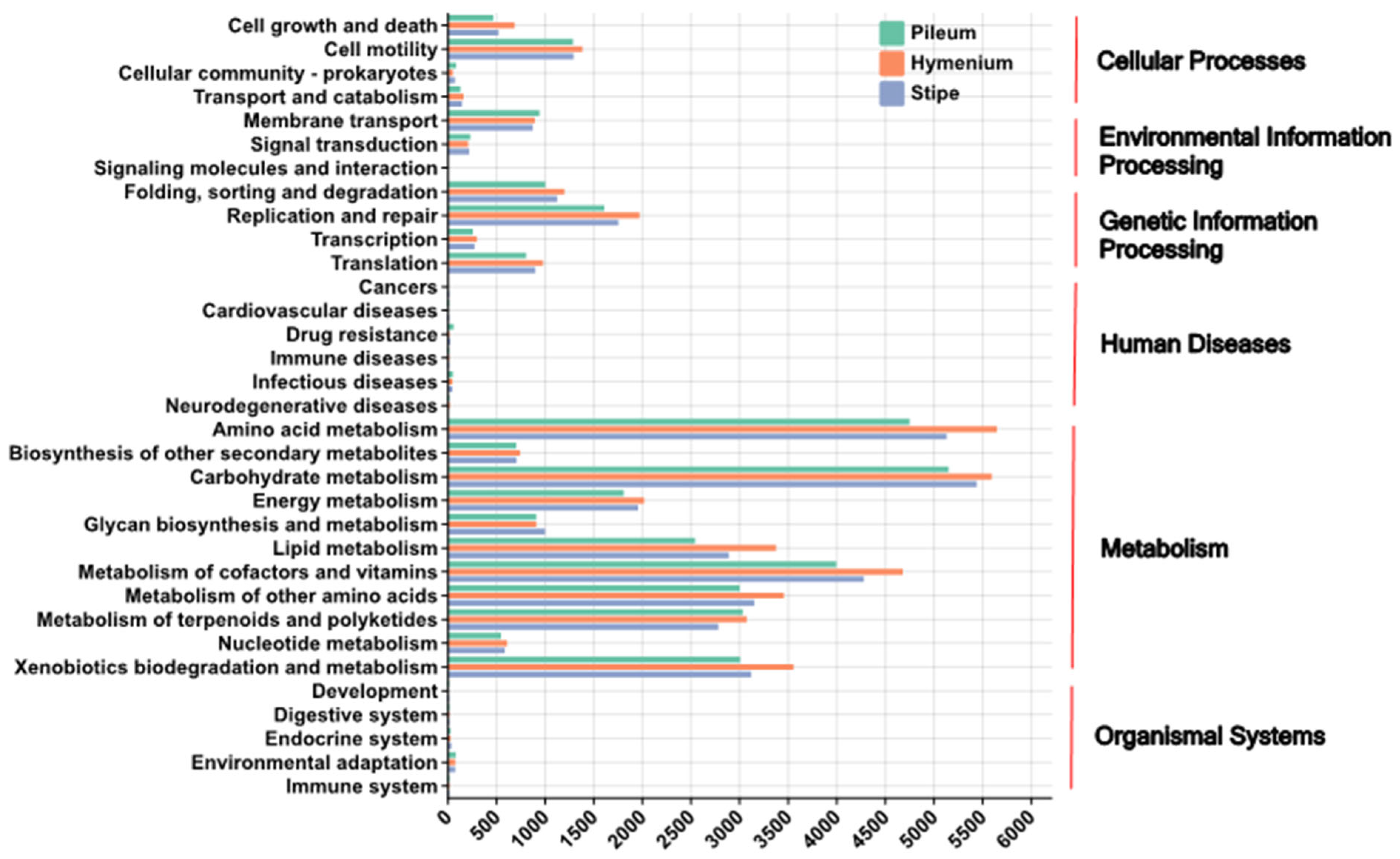 Figure 10). The analysis of predictive functional pathways revealed a marked disparity in metabolic potential across the fungal tissues. The hymenophore-associated bacteriome demonstrated functional predominance, exhibiting the highest predicted activity in 19 of the 33 identified pathways (58%). This contrasted with the pileus and stipe tissues, where the resident bacteriomes showed predominance in only 10 (30%) and 2 (6%) pathways, respectively. The pronounced functional gradient, with a near ten-fold reduction in predominant pathways from the hymenophore to the stipe, underscores a significant stratification of metabolic roles within the fruiting body’s bacteriome. This distribution suggests that the bacterial community is not homogenously distributed but is highly structured, with its most robust and diverse metabolic contributions being localized to the fertile, spore-producing hymenophore. This finding strongly implies a tissue-specific functional specialization within the fungal holobiont, where the bacteriome’s role is most critical in supporting reproductive functions. This tissue-specific functional disparity suggests the hymenophore constitutes a distinct ecological microhabitat, fostering bacteria with heightened metabolic, cellular, and genetic processing activities. From a physiological perspective, the elevated functional capacity implies a critical symbiotic role for these bacteria in supporting the fungal reproductive effort. The enrichment of metabolic pathways suggests active bacterial involvement in nutrient acquisition, vitamin synthesis, or the provision of metabolic precursors essential for sporulation. Concurrently, the upregulation of cellular processes may indicate a role in biofilm formation or the biosynthesis of antimicrobial compounds, serving to protect the developing spores from pathogens and competitors. This represents a potential division of labor where the fungus outsources key physiological functions to its bacterial partners. Evolutionarily, the localization of this metabolically active bacteriome to the reproductive tissue indicates a co-evolved mutualism under strong selective pressure. Fungal genotypes that recruit and maintain such beneficial microbial communities would gain a direct fitness advantage through enhanced spore viability, protection, and dispersal success. This functional specialization suggests the hymenophore has evolved not merely as a fungal structure, but as a complex holobiont interface. Consequently, the reproductive success of