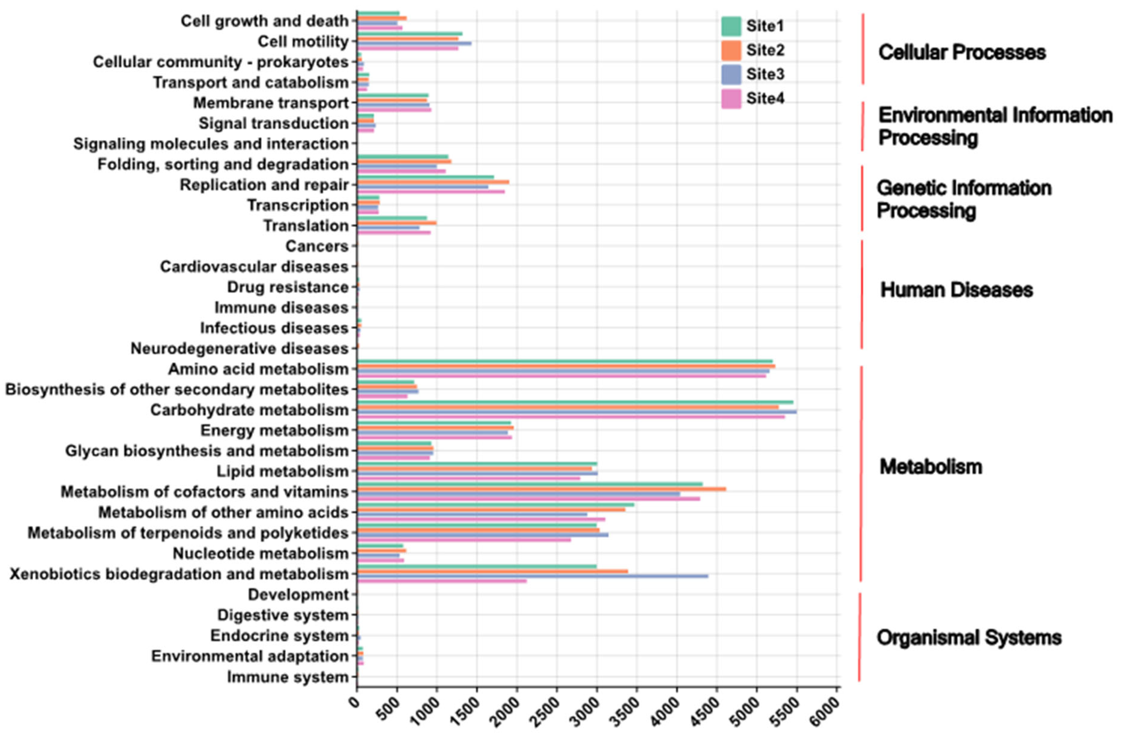 Quantitative analysis of Kyoto Encyclopedia of Genes and Genomes (KEGG) pathway abundances, predicted via PICRUSt2, indicated that the potential functional profile of the