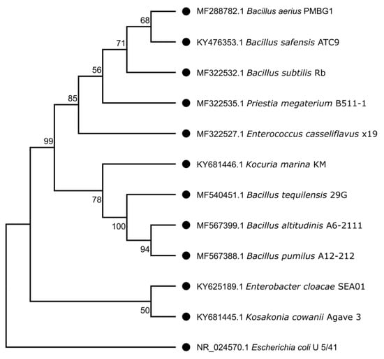 A total of 50 bacterial endophytes were isolated from Agave tequilana seeds. Isolates were selected based on colony morphology, including differences in size, pigmentation, and appearance time within the first 72 h of incubation. After eliminating redundant morphotypes (sibling colonies), 11 unique isolates were selected and identified using matrix-assisted laser desorption/ionization–time of flight (MALDI-TOF) mass spectrometry. These isolates were assigned to the genera Bacillus (B. aerius, B. altitudinis, B. megaterium, B. tequilensis, B. safensis, B. subtilis, and B. pumilus), Enterococcus casseliflavus, Enterobacter cloacae, Kosakonia cowanii, and the actinobacterial genus Kocuria (K. marina). To validate the identifications, 16S rDNA sequencing was performed on all selected isolates, revealing a 95% concordance with the MALDI-TOF results. Notably, the strain identified as Bacillus megaterium by MALDI-TOF was classified as Priestia megaterium based on 16S rDNA, consistent with the reclassification of this species [50]. The 16S rDNA sequences were deposited in GenBank under the following accession numbers: E. cloacae SEA01 (KY625189.1), E. casseliflavus x19 (MF322527.1), K. cowanii Agave3 (KY681445.1), K. marina KM (KY681446.1), B. altitudinis A6-2111 (MF567399.1), B. pumilus A12-212 (MF567388.1), B. safensis ATC9 (KY476353.1), B. tequilensis 29G (MF540451.1), B. aerius PMBG1 (MF288782.1), B. subtilis Rb (MF322532.1), and P. megaterium B511-5 (MF322535.1).