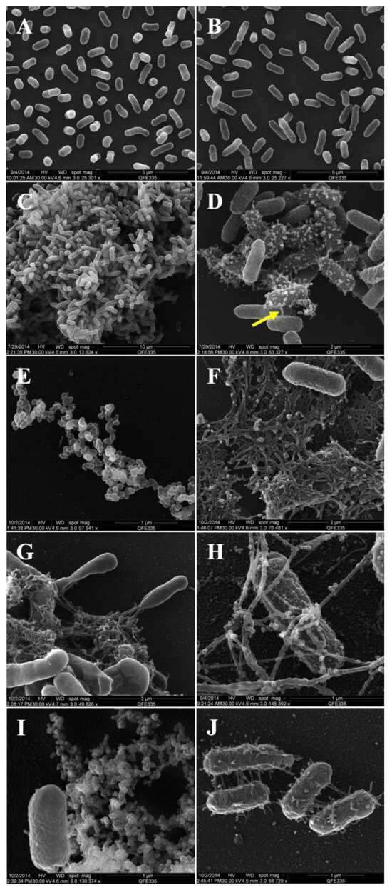 Scanning electron micrographs illustrating the dynamic process of outer membrane vesicle (OMV) production and biofilm formation by E. cloacae SEA01 over a 48 h period. (A) At 0 h, bacterial cells exhibit typical rod-shaped morphology. (B) At 5 h, elongation of cells indicates active division in liquid M9 medium. (C) At 9 h, microcolony formation begins, accompanied by initial vesicle production on the cell surface. (D) Close-up view of OMVs and intercellular connections via “nanopod”-like projections (yellow arrow). (E) At 18 h, detached OMVs are observed dispersed in the biofilm matrix. (F) Aggregated biofilm-derived extracellular vesicles (OMVs) embedded in a maturing biofilm matrix at 18 h. (G) At 24 h, a mature biofilm structure with actively migrating cells is evident. (H) Filamentous networks, possibly pili, are seen connecting cells and are coated with OMVs. (I) After 48 h, extensive vesicle OMV release occurs and (J) Cells at the late stage are densely covered fimbriae-associated OMVs. Scale bars are indicated in each panel.