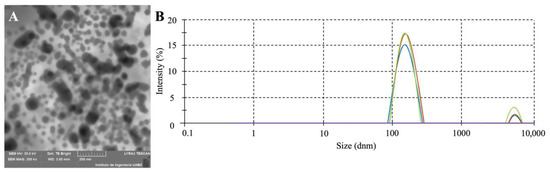 Dynamic light scattering (DLS) analysis was conducted on vesicles isolated from a 9 h culture of E. cloacae SEA01 (Figure 3A). The DLS results revealed a unimodal size distribution ranging from 75 to 400 nm, with an average hydrodynamic diameter of 153.1 nm (Figure 3B). To assess the colloidal stability of the vesicle suspensions, Zeta potential measurements were also performed. Typically, absolute Zeta potential values exceeding ±30 mV are indicative of stable dispersions due to strong electrostatic repulsion, while lower values suggest propensity for particle aggregation. The vesicles of E. cloacae SEA01 exhibited an average zeta potential of −26.1 mV and an electrophoretic mobility of −2.041 μm-cm/V-s, suggesting moderate colloidal stability and a tendency toward aggregate.