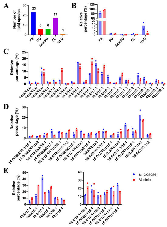 Lipid composition of E. cloacae SEA01 vegetative cells and their outer membrane vesicles (OMVs). (A) Total number of identified lipid species grouped into five lipid classes: phosphatidylethanolamine (PE), phosphatidylglyceron (PG), acylphosphatidylglycerol (Acyl-PG), cardiolipin (CL), and ubiquinone (UbQ8). (B) Relative abundance (5%) of each lipid class in vegetative cells (blue) and OMVs (red), showing PE as the dominant class in both fractions. (C–E) Relative distribution of individual lipid molecular species within each class (C) PE, (D) CL, and (E) PG and Acyl-PG. OMVs exhibited a enrichment in lipid species containing 16:1 and 18:1 fatty acyl chains-such as PE (16:0/16:1) and PG (16:0/18:1)-while species containing 17:1 and 19:1 chains were more abundant in vegetative cells. Data represent means ± SD of two biological replicates (n = 2). Colored bars represent OMVs (red) and vegetative cells (blue).