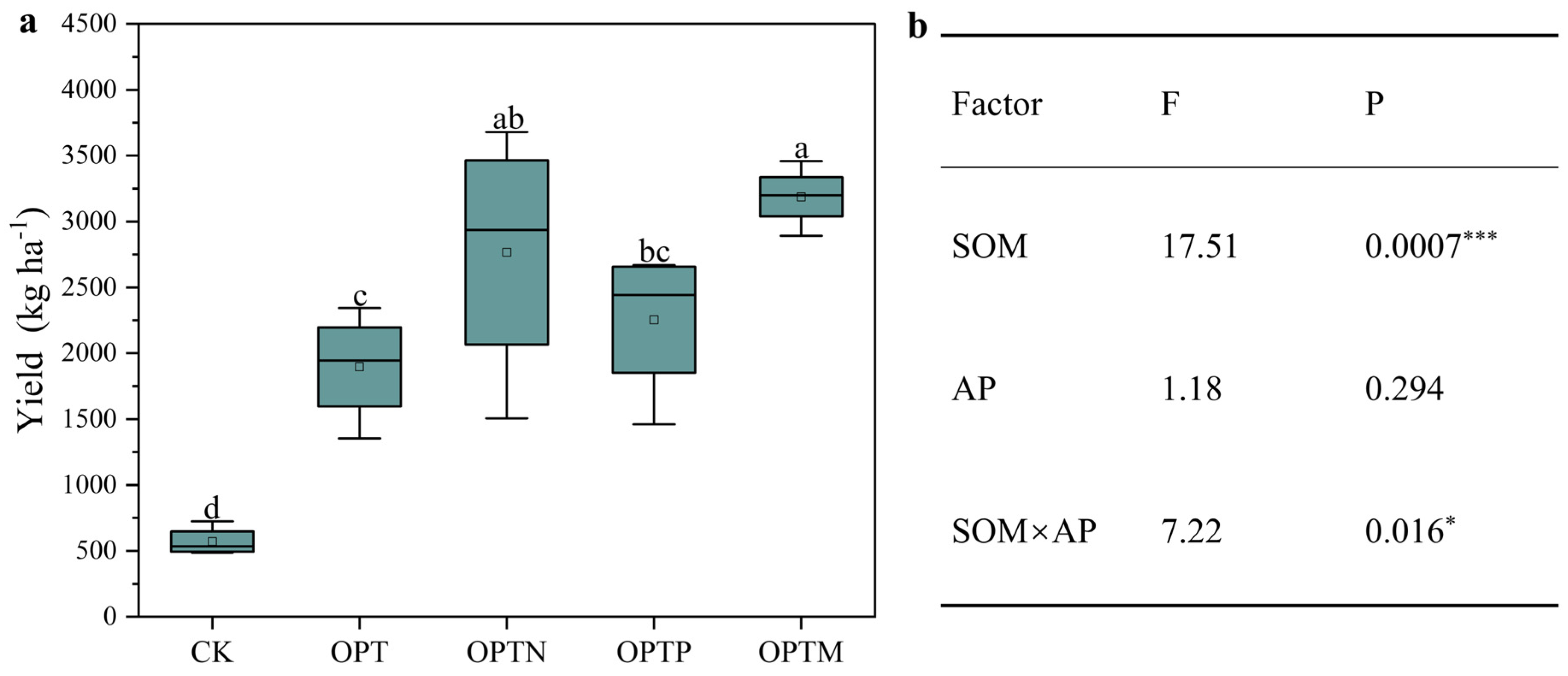 SOM (g kg−1) | 22.23 ± 0.73 c | 26.57 ± 1.93 b | 27.45 ± 2.24 b | 26.92 ± 1.34 b | 33.16 ± 2.35 a |
