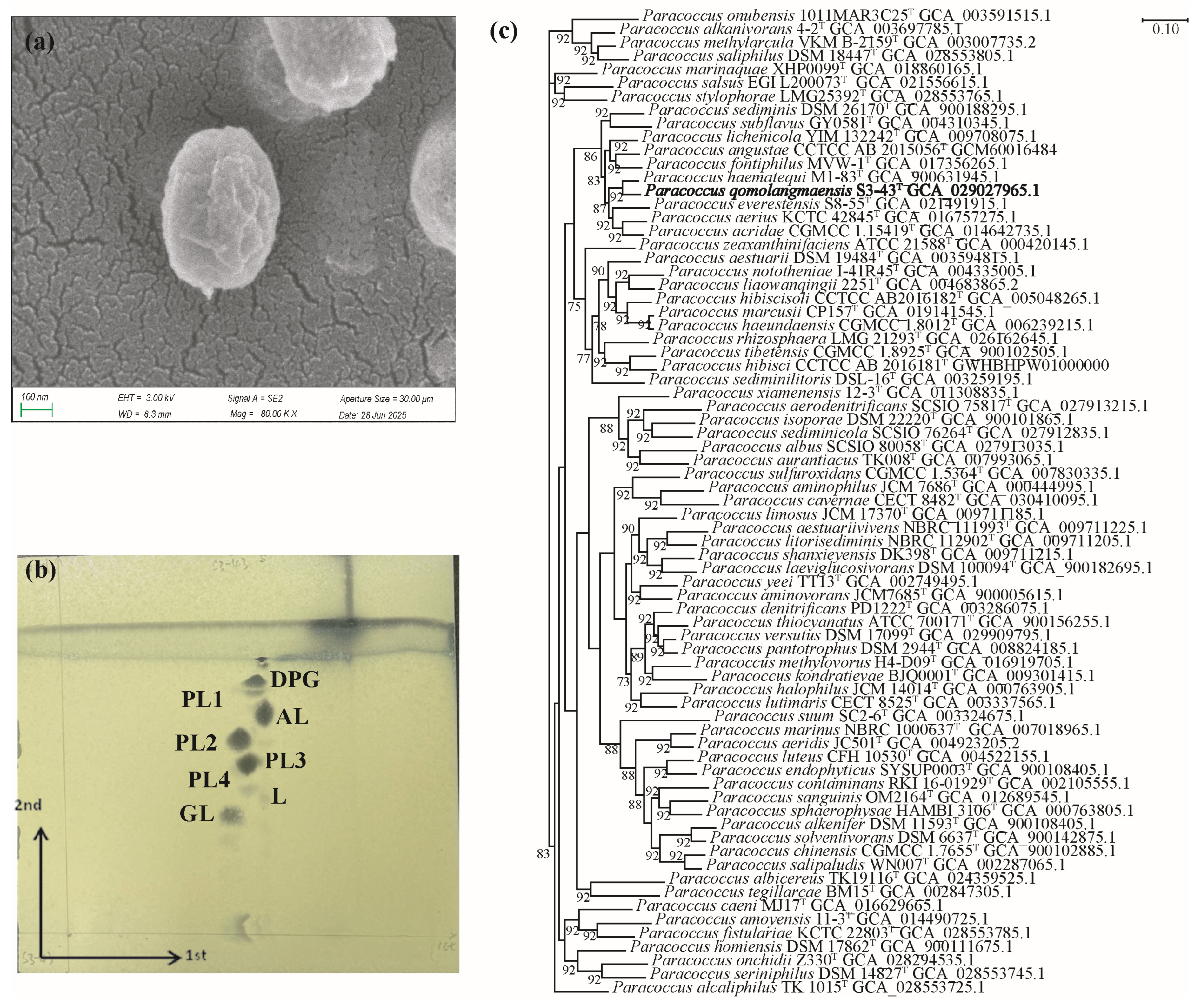 - Cui, X.; Liu, Y.; Xu, Y.; Chen, T.; Zhang, S.; Wang, J.; Yang, R.; Liu, G.; Zhang, W.; Zhang, G. Paracoccus everestensis sp. nov., a novel bacterium with great antioxidant capacity isolated from the north slope of Mount Everest. Int. J. Syst. Evol. Microbiol. 2022, 72, 5562. [Google Scholar] [CrossRef]