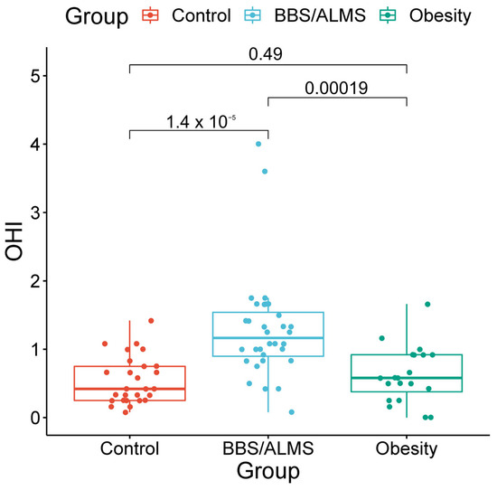 This study represents the first evaluation of the oral microbiome in patients with Alström and Bardet-Biedl syndromes and heterozygous carriers of causative variants in the ALMS1 and BBS genes. Importantly, although none of the subjects had periodontitis, patients in the study group had the highest OHI scores, indicating inadequate oral hygiene. Due to neurodevelopmental and intellectual disorders, our patients have and, unfortunately, will continue to have poorer hygiene, as described in many genetic syndromes, including ciliopathies [41,42,43,44,45]. Recently, higher OHI values were described in patients with poor metabolic control of type 2 diabetes and in patients with type 2 diabetes and obesity [46,47].