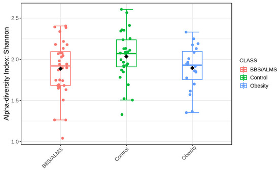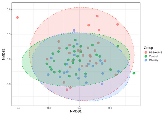 Analysis of alpha diversity using Shannon’s method indicated no statistically significant differences in diversity between the studied groups. However, there was a trend suggesting that the control group had the highest average alpha diversity compared to the other two studied groups, p = 0.133 (Figure 4). However, beta diversity, an analysis that indicates differences in the composition of bacterial genera, suggests that the BBS/ALMS group stands out from the other studied groups, p < 0.031 (Figure 5).