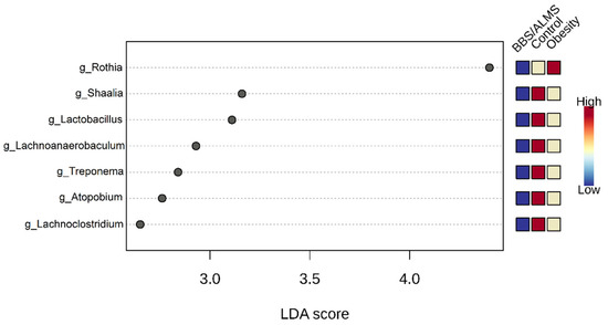 Interestingly, the LEfSe analysis identified the seven most differentiating bacterial genera, including the three main ones: Rothia, Shaalia and Lactobacillus, for which the Linear Discriminant Analysis (LDA) score was above 3 (p < 0.015) (Figure 6).