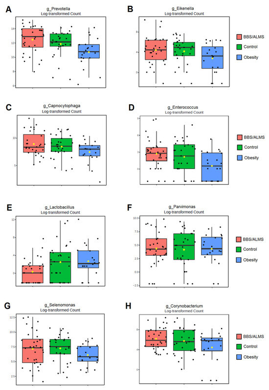 Univariate analysis showed that eight bacterial genera were significantly different in the study group compared to both the obese and healthy groups (Figure 7). The genera Prevotella and Enterococcus were considerably more abundant in the BBS/ALMS group than in the group with obesity (p = 0.00006 and 0.00007, respectively) and the control group (p = 0.0034 and 0.0088, respectively) (Figure 7A,D). In contrast, Eikenella, Capnocytophaga, Parvimonas, and Selenomonas were more abundant in the study group than in the obese group (p = 0.000006, 0.00004, 0.0044, and 0.000002, respectively) but less abundant than in the healthy group (p = 0.00001, 0.0001, 0.00016, and 0.0000015, respectively) (Figure 7B,C,F,G). Furthermore, Corynobacterium was more abundant in the BBS/ALMS group than in the healthy group (p = 0.00824), but less abundant than in the obese group (p = 0.00031) (Figure 7H). Lactobacillus abundance was lowest in the study group compared to both other groups (p = 0.00087 and 0.0000003, respectively) (Figure 7E).