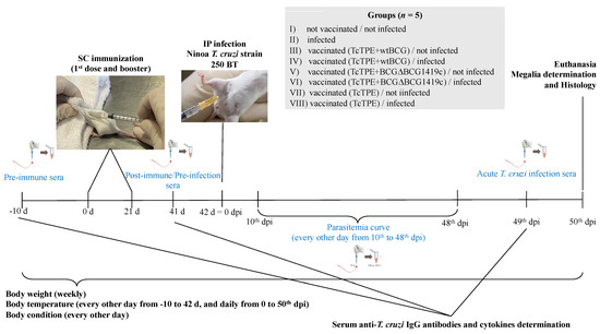 Timeline and interventions of the study. Eight groups of BALB/c mice were subcutaneously immunized twice at 21-day interval with 100 µL containing 10–15 µg of the TcTPE plus 104 CFU of wtBCG or BCG∆BCG1419c strain in 100 μL each to evaluate the effectiveness of the two BCG strains as adjuvants. All procedures were performed in duplicate, and data showed in the subsequent figures are representative of the two independent experiments. SC = subcutaneous, IP = intraperitoneal, BT = blood trypomastigotes, d = days, dpi = day post-infection, TcTPE = total protein extract from Trypanosoma cruzi.