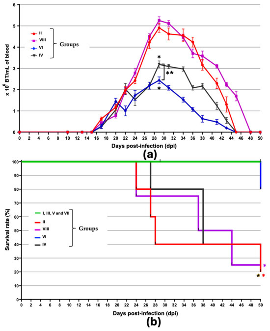 Parasitemia curve (a) and survival rate (b) of T. cruzi-infected mice, previously vaccinated. Values represented in (a) are the mean and standard deviation (S.D.) of the amount of blood trypomastigotes (BT) quantified in each mouse. Parasitemia peaks of groups IV, VI, and VIII were compared with group II (not vaccinated/infected mice) using the one-way ANOVA statistical test, followed by the Tukey post hoc test, and the differences were considered significant (*) when p ≤ 0.05. In addition, when comparing groups IV and VI with each other, a significant difference (**) was also found (p ≤ 0.05). In (b), the survival of groups II, IV, VI, and VIII was compared with respect to groups I, II, V, and VII (not infected mice); the Kaplan–Meier statistical test was used, followed by the Log-rank test (Mantel–Cox) to determine the existence of a significant difference (*) (p ≤ 0.05). Both assays are representative of duplicates performed independently. Group I = not vaccinated/not infected; group II = not vaccinated/infected; group III = TcTPE-vaccinated + wtBCG as adjuvant/not infected; group IV = TcTPE-vaccinated + wtBCG as adjuvant/infected; group V = TcTPE-vaccinated + BCG∆BCG1419c as adjuvant/not infected; group VI = TcTPE-vaccinated + BCG∆BCG1419c as adjuvant/infected; group VII = TcTPE-vaccinated/not infected; group VIII = TcTPE-vaccinated/infected.