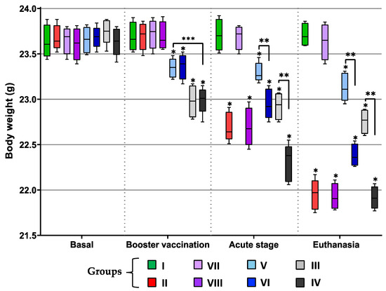 Body weight of BCG-immunized or not immunized mice and infected or not with T. cruzi. Values show the mean with S.D. for each group and are representative of two independent experiments with equivalent results. The values were grouped into four stages (see timeline for further reference, Figure 1): baseline, from −10 d to 0 d; booster vaccination, from 1 d to 42 d; acute stage, from 2nd to 48th dpi and euthanasia, from 48th to 50th dpi. Values from each time were analyzed through multiple comparisons among groups by two-way ANOVA test followed by Dunnett’s post hoc test, and significant difference is shown (*) when p ≤ 0.05 compared to the group I (healthy mice), (**) when comparing the groups immunized with wtBCG or BCG∆BCG1419c as adjuvants without infection vs. their infected counterpart groups, and (***) when both adjuvants were compared between them. Group I = not vaccinated/not infected; group II = not vaccinated/infected; group III = TcTPE-vaccinated + wtBCG as adjuvant/not infected; group IV = TcTPE-vaccinated + wtBCG as adjuvant/infected; group V = TcTPE-vaccinated + BCG∆BCG1419c as adjuvant/not infected; group VI = TcTPE-vaccinated + BCG∆BCG1419c as adjuvant/infected; group VII = TcTPE-vaccinated/not infected; group VIII = TcTPE-vaccinated/infected.