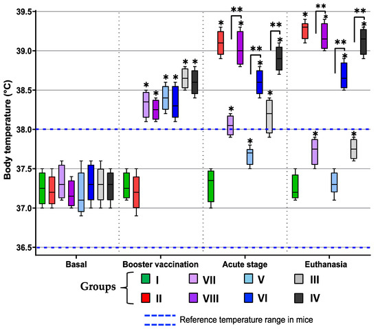 Body temperature of mice immunized with the vaccine formulation of TcTPE using M. bovis BCG strains as adjuvants and infected with T. cruzi. Values were analyzed with the one-way ANOVA statistical test followed by the Tukey post hoc test at each time point (basal, booster vaccination, acute stage, and euthanasia), and a significant difference was demonstrated (*, p ≤ 0.05) when comparing against the group I (healthy mice), and (**, p ≤ 0.05) when comparing the groups immunized with wtBCG or BCG∆BCG1419c as adjuvants without infection (groups III and V, respectively) vs. their infected counterpart groups (groups IV and VI, respectively). The dotted lines show the normal temperature range in mice. Group I = not vaccinated/not infected; group II = not vaccinated/infected; group III = TcTPE-vaccinated + wtBCG as adjuvant/not infected; group IV = TcTPE-vaccinated + wtBCG as adjuvant/infected; group V = TcTPE-vaccinated + BCG∆BCG1419c as adjuvant/not infected; group VI = TcTPE-vaccinated + BCG∆BCG1419c as adjuvant/infected; group VII = TcTPE-vaccinated/not infected; group VIII = TcTPE-vaccinated/infected.