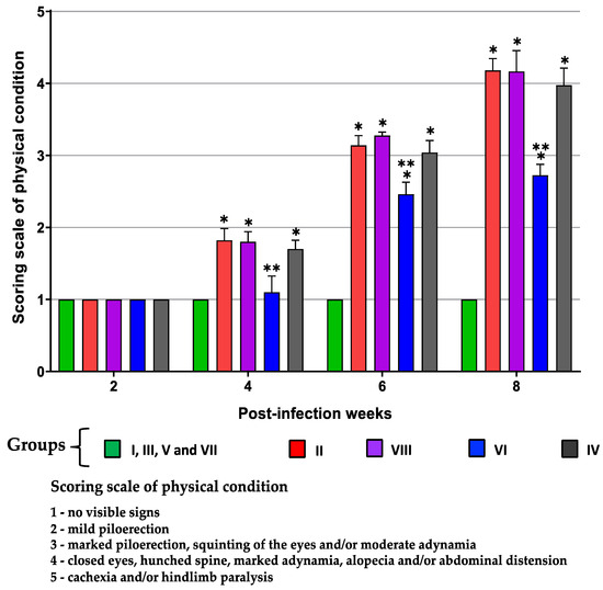 Physical condition record of mice immunized with the vaccine formulation of TcTPE using M. bovis BCG strains as adjuvants and infected with T. cruzi. Values show the mean with the S.D. of each group, which were analyzed with the nonparametric statistical test of Kruskal–Wallis followed by the Dunn post hoc test, and a significant difference was demonstrated (*, p ≤ 0.05) when comparing against the group I (healthy mice) and (**, p ≤ 0.05) when comparing against the group II (not vaccinated and infected mice). Group I = not vaccinated/not infected; group II = not vaccinated/infected; group III = TcTPE-vaccinated + wtBCG as adjuvant/not infected; group IV = TcTPE-vaccinated + wtBCG as adjuvant/infected; group V = TcTPE-vaccinated + BCG∆BCG1419c as adjuvant/not infected; group VI = TcTPE-vaccinated + BCG∆BCG1419c as adjuvant/infected; group VII = TcTPE-vaccinated/not infected; group VIII = TcTPE-vaccinated/infected.