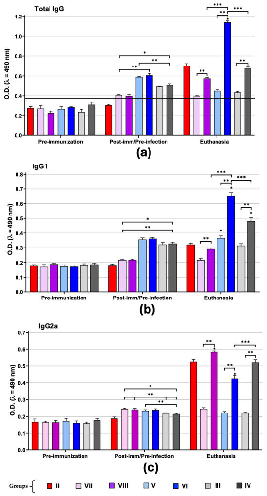 In the post-immunization/pre-infection period, all immunized groups induced the production of anti-T. cruzi IgG antibodies by the administration of TcTPE regardless of whether it was administered together with BCG∆BCG1419c or BCG Pasteur ATCC 35734 as an adjuvant. In the case of total IgG antibodies (Figure 6a), a higher production of anti-T. cruzi antibodies was induced in mice vaccinated with TcTPE plus BCG∆BCG1419c as an adjuvant (groups V and VI). The wtBCG strain had no adjuvant effect, since the induced IgG antibody titers were similar to those of animals vaccinated with the antigen alone. At the time of euthanasia, antibody production was significantly increased in previously vaccinated-infected animals, and these levels were not reached with immunization alone; however, the infection by itself elicited greater antibodies production (group II) than that achieved by vaccination/infection when the TcTPE (group VIII) and TcTPE plus wtBCG (group IV) vaccine formulations were used, and only group VI (TcTPE + BCG∆BCG1419c vaccinated/infected) showed a significant difference with respect to group II (* p ≤ 0.05) and with respect to the groups in which the other two vaccine formulations were administered (*** p ≤ 0.05), indicating that, during the acute stage, vaccination enhanced the production of anti-T. cruzi antibodies when BCG∆BCG1419c was used as an adjuvant.