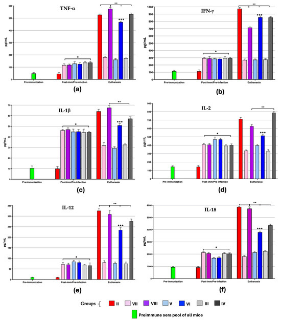 Serum cytokines concentration of the Th1 immune profile in mice immunized with the vaccine formulation of TcTPE using M. bovis BCG strains as adjuvants and infected with T. cruzi. Values represent the mean ± S.D. of the cytokine levels (pg/mL) by group: TNF-α (a), IFN-γ (b), IL-1β (c), IL-2 (d), IL-12 (e), and IL-18 (f). The one-way ANOVA statistical test followed by the Tukey post hoc test was used to determine the existence of a significant difference (* p ≤ 0.05) with respect to the baseline concentration (preimmune sera pool of all mice or group II at post-imm/pre-infection time), (** p ≤ 0.05) of the euthanasia-time groups with respect to their corresponding ones in the post-vaccination/pre-infection time and (*** p ≤ 0.05) when the infected groups (vaccinated or not) were compared between them. Post-imm = post-immunization. Group I = not vaccinated/not infected; group II = not vaccinated/infected; group III = TcTPE-vaccinated + wtBCG as adjuvant/not infected; group IV = TcTPE-vaccinated + wtBCG as adjuvant/infected; group V = TcTPE-vaccinated + BCG∆BCG1419c as adjuvant/not infected; group VI = TcTPE-vaccinated + BCG∆BCG1419c as adjuvant/infected; group VII = TcTPE-vaccinated/not infected; group VIII = TcTPE-vaccinated/infected.