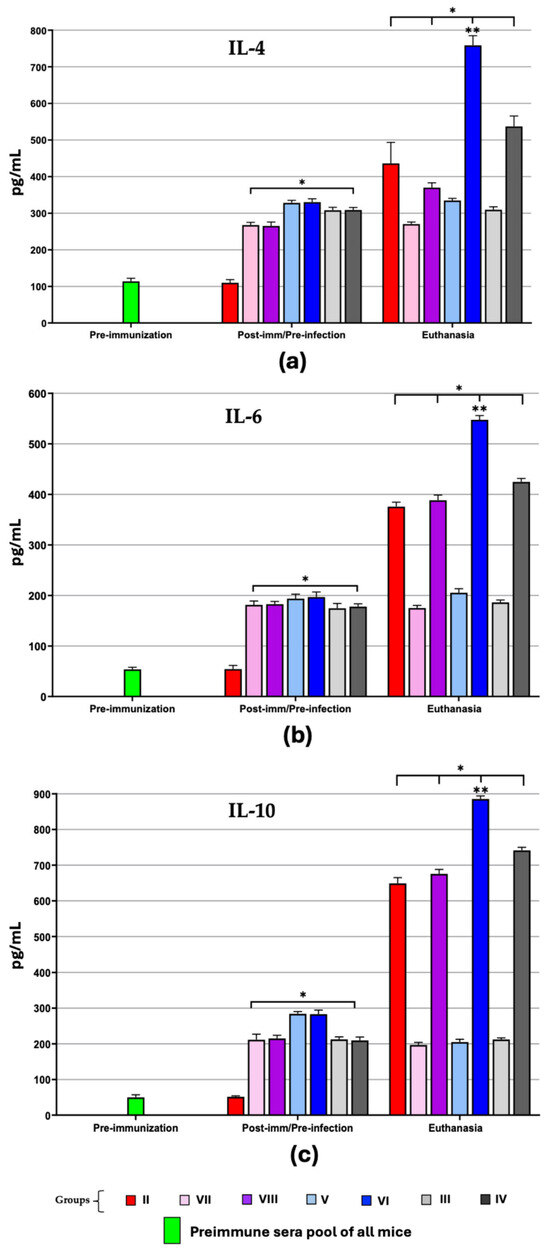In post-vaccination/pre-infection time, all immunized groups showed a significant increase (* p ≤ 0.05) of IL-4, IL-6, and IL-10 cytokines with 200–300 pg/mL levels, with no difference between groups, very similar to the TNF-α, IFN-γ, and IL-12 concentrations but lower than IL-2 and IL-18 and higher than IL-1β levels; therefore, it is not possible to determine with certainty if there is a predominance of any immunological profile at this time (Figure 8). At the time of euthanasia (acute stage of T. cruzi infection), IL-4, IL-6, and IL-10 levels had a small increase in the four groups that were infected (three immunized and one was not), while in the immunized but not-infected groups, concentrations remained similar to those at the post-immunization/pre-infection time (p > 0.05).