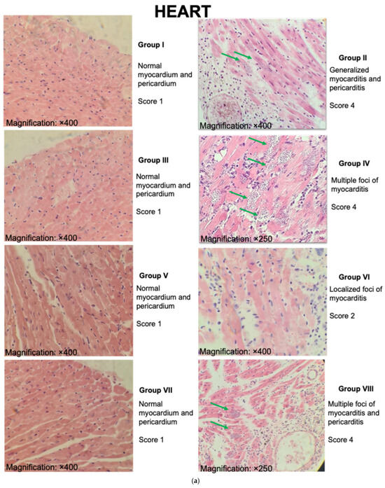 In the acute stage, at 30th dpi, when the highest number of deaths occurred in groups II, IV, and VII, all animals were euthanized for the evaluation of macro- and microscopic findings. To determine visceral megalia, the index of the heart, spleen, and lymph nodes was calculated, and no differences were found with respect to the group I (healthy mice), except for cardiomegaly and splenomegaly in the group II (Supplementary data).