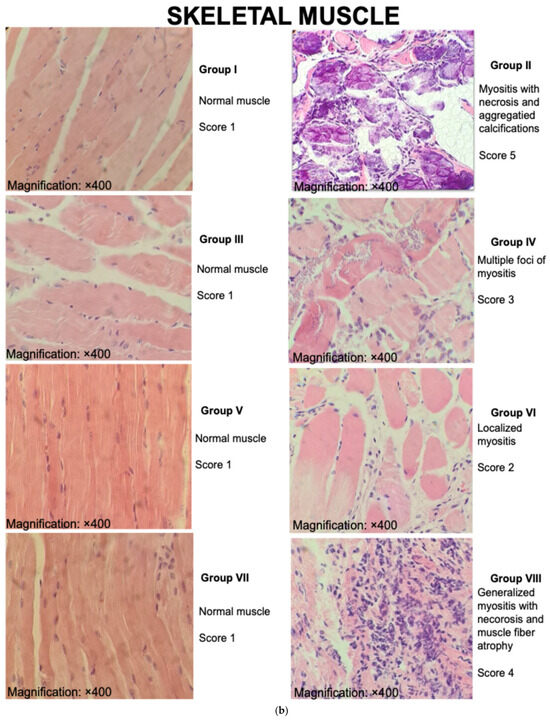 Cardiac and skeletal muscle tissue were analyzed histopathologically, findings were represented quantitatively, and the values were compared with those of the group I with a score of 1 (healthy mice). The group immunized with TcTPE using BCG∆BCG1419c as an adjuvant and infected with T. cruzi (Group VI) showed minor histological changes, with a damage grade score of 2 in both cardiac tissue and skeletal muscle. Group VIII, as well as group II, in which animals died due to ChD, presented the highest number of tissue amastigotes nests with a damage grade score greater than 4 in cardiac muscle and skeletal muscle. The tissue damage score did not represent a significant difference in group IV (TcTPE + wtBCG-vaccinated/infected); however, 80% of the animals died, and all of them (100%) had marked physical deterioration (Figure 9 and Figure 10).