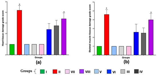 Scores of tissue damage degree from mice immunized with the vaccine formulation of TcTPE using M. bovis BCG strains as adjuvants and infected with T. cruzi. Values represent the mean ± S.D. of the heart (a) or skeletal muscle, (b) damage degree scores from each mouse per group at 30th dpi (acute phase of ChD). Kruskal–Wallis test was used for determining significant differences when (*) p ≤ 0.05 when comparing all groups with the I group healthy mice. Group I = not vaccinated/not infected; group II = not vaccinated/infected; group III = TcTPE-vaccinated + wtBCG as adjuvant/not infected; group IV = TcTPE-vaccinated + wtBCG as adjuvant/infected; group V = TcTPE-vaccinated + BCG∆BCG1419c as adjuvant/not infected; group VI = TcTPE-vaccinated + BCG∆BCG1419c as adjuvant/infected; group VII = TcTPE-vaccinated/not infected; group VIII = TcTPE-vaccinated/infected.